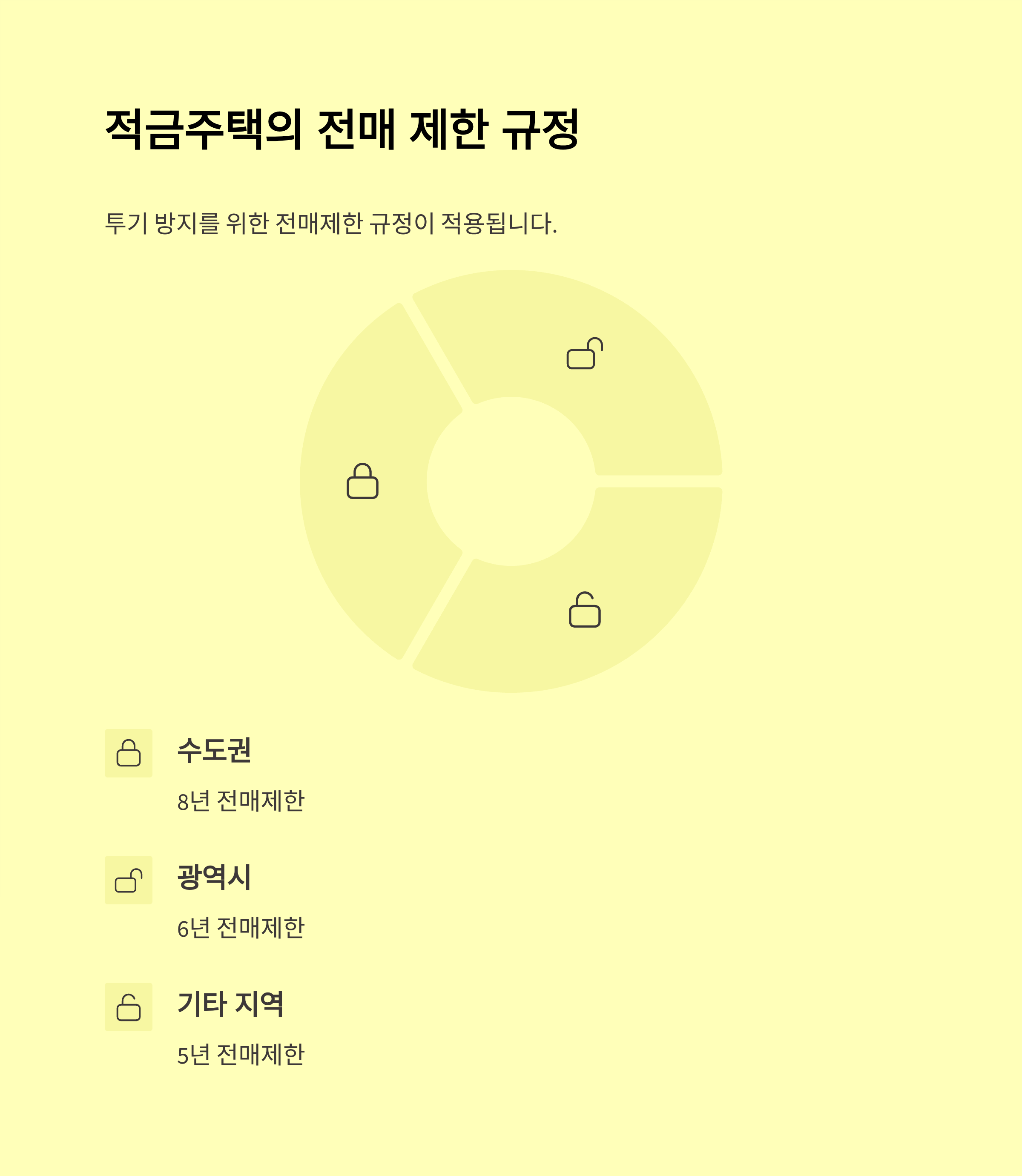 - 전매 제한: 의무 거주 기간 포함 최장 10년간 제3자에게 판매 금지