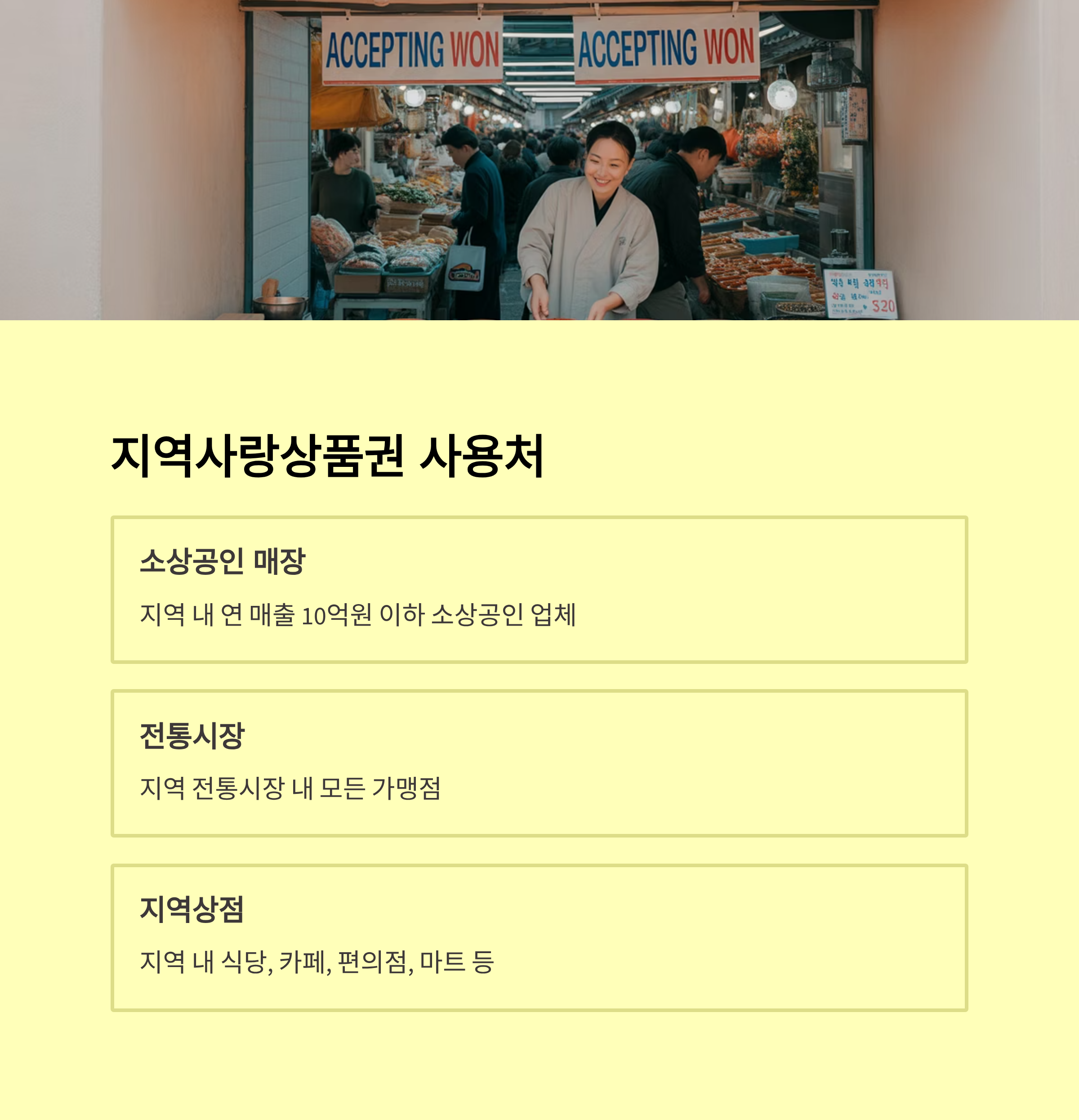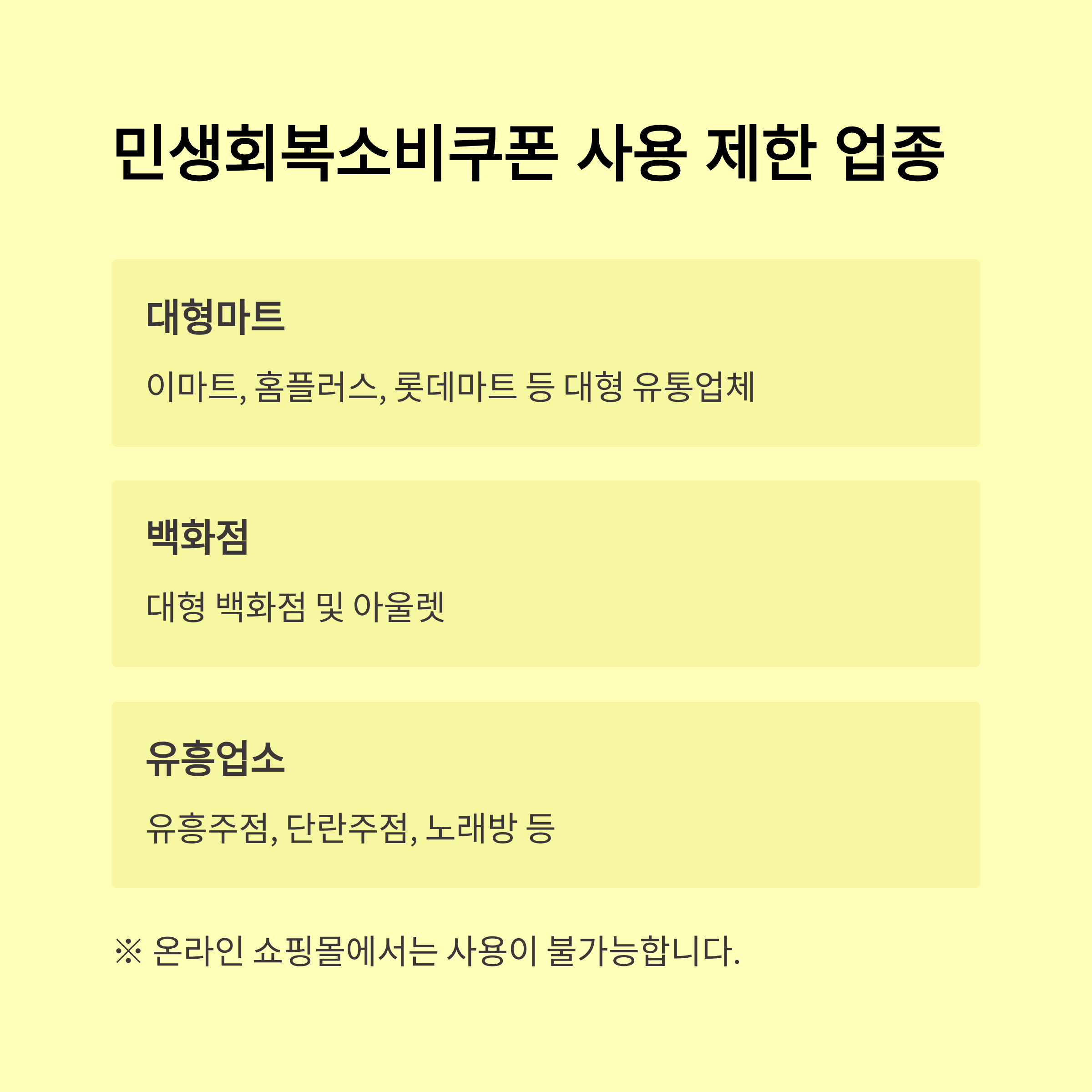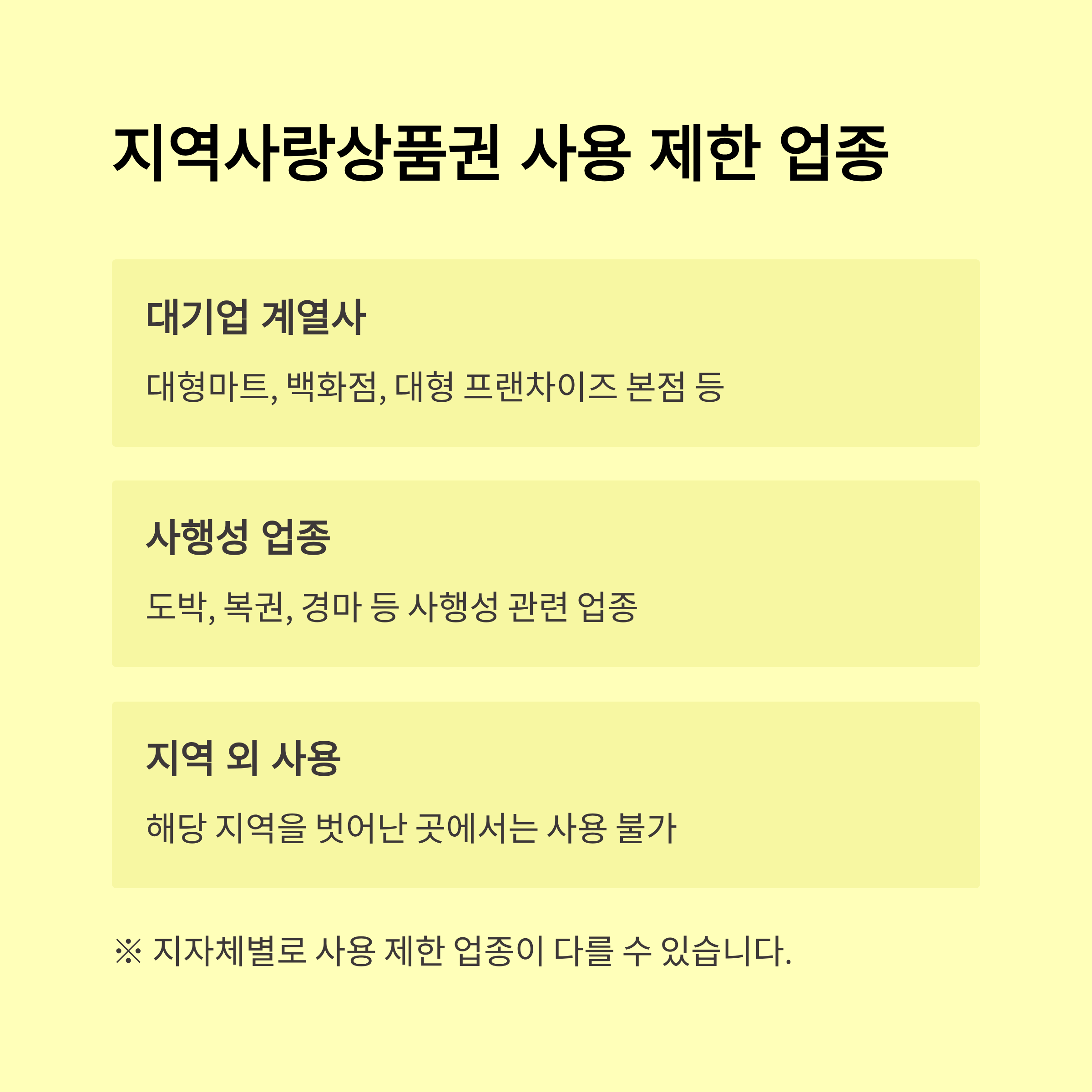 | 마트·편의점 | 지역 중소마트, 슈퍼 | 대형마트 사용 불가 |