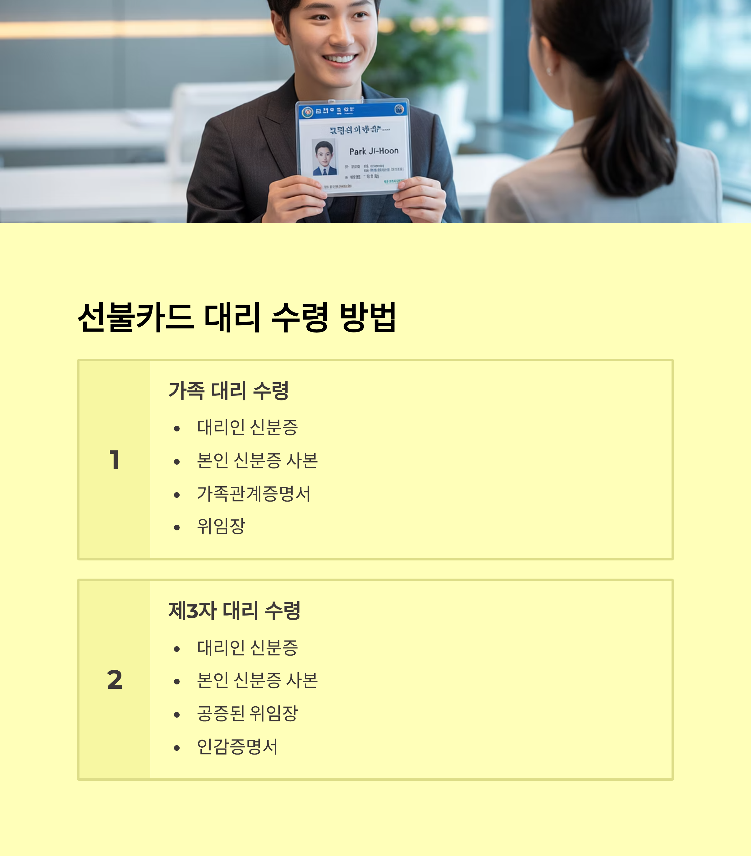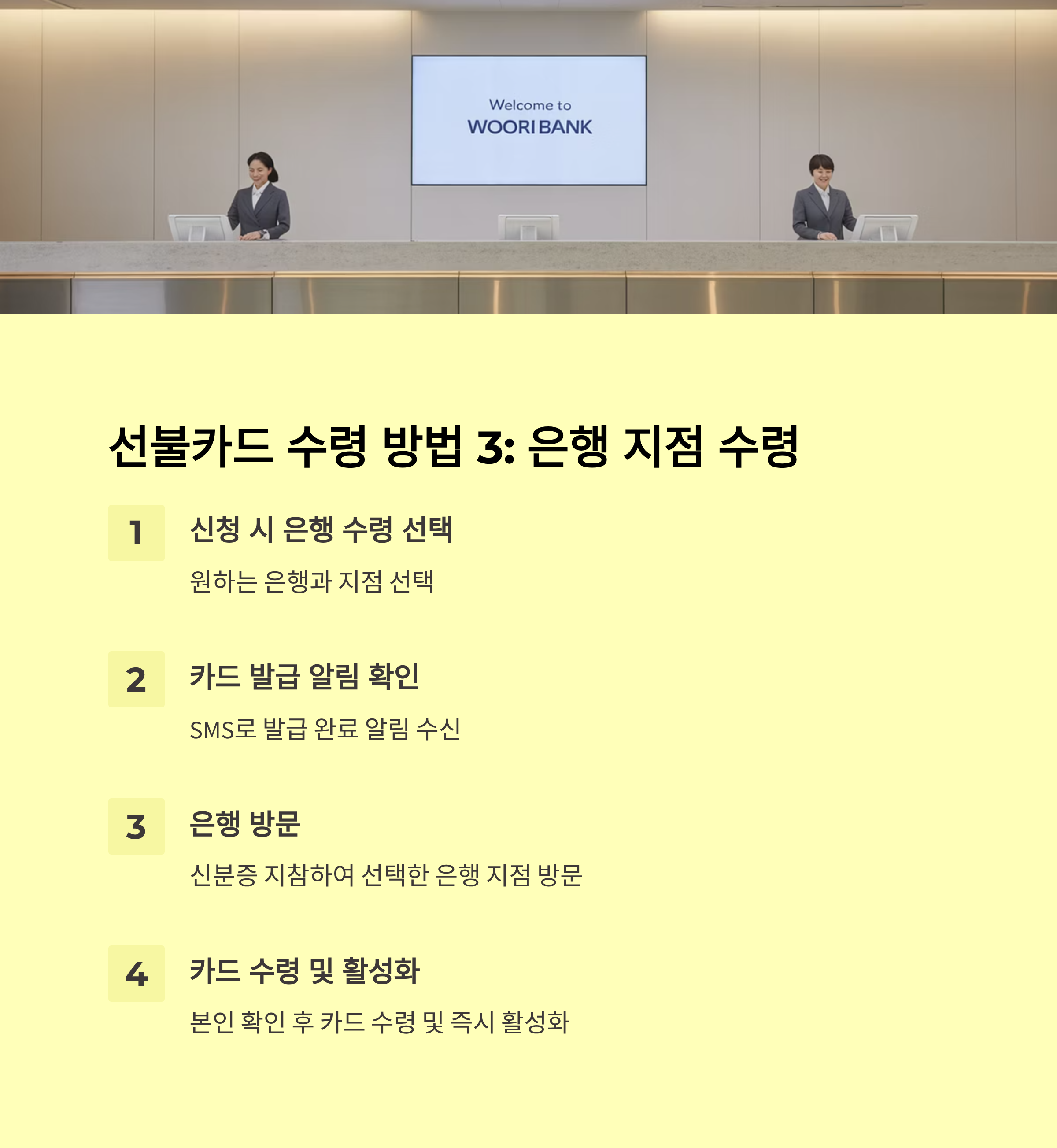 카드 수령 시에는 ‘본인 확인’이 필수이므로 꼭 본인이 직접 수령해야 해요. 대리수령이 필요한 경우 위임장과 대리인 신분증이 필요해요.