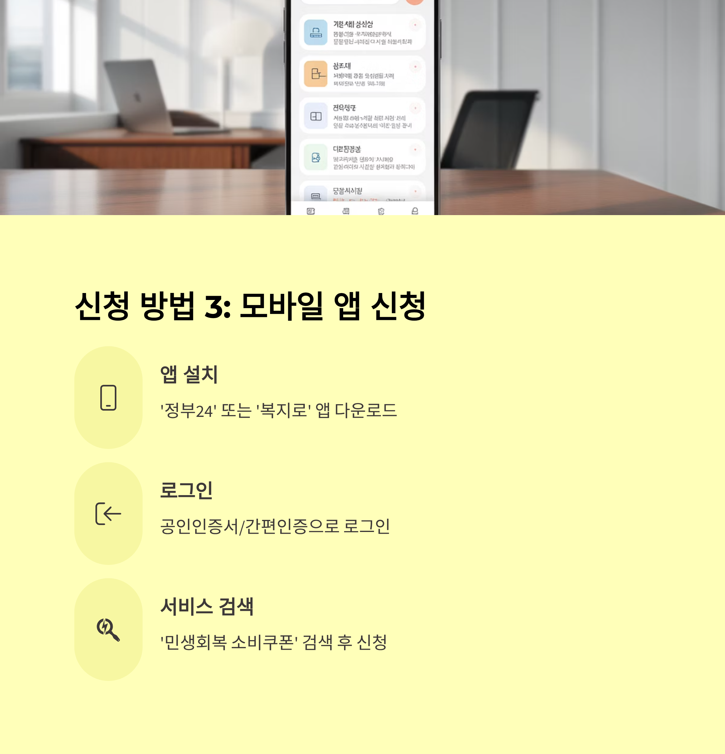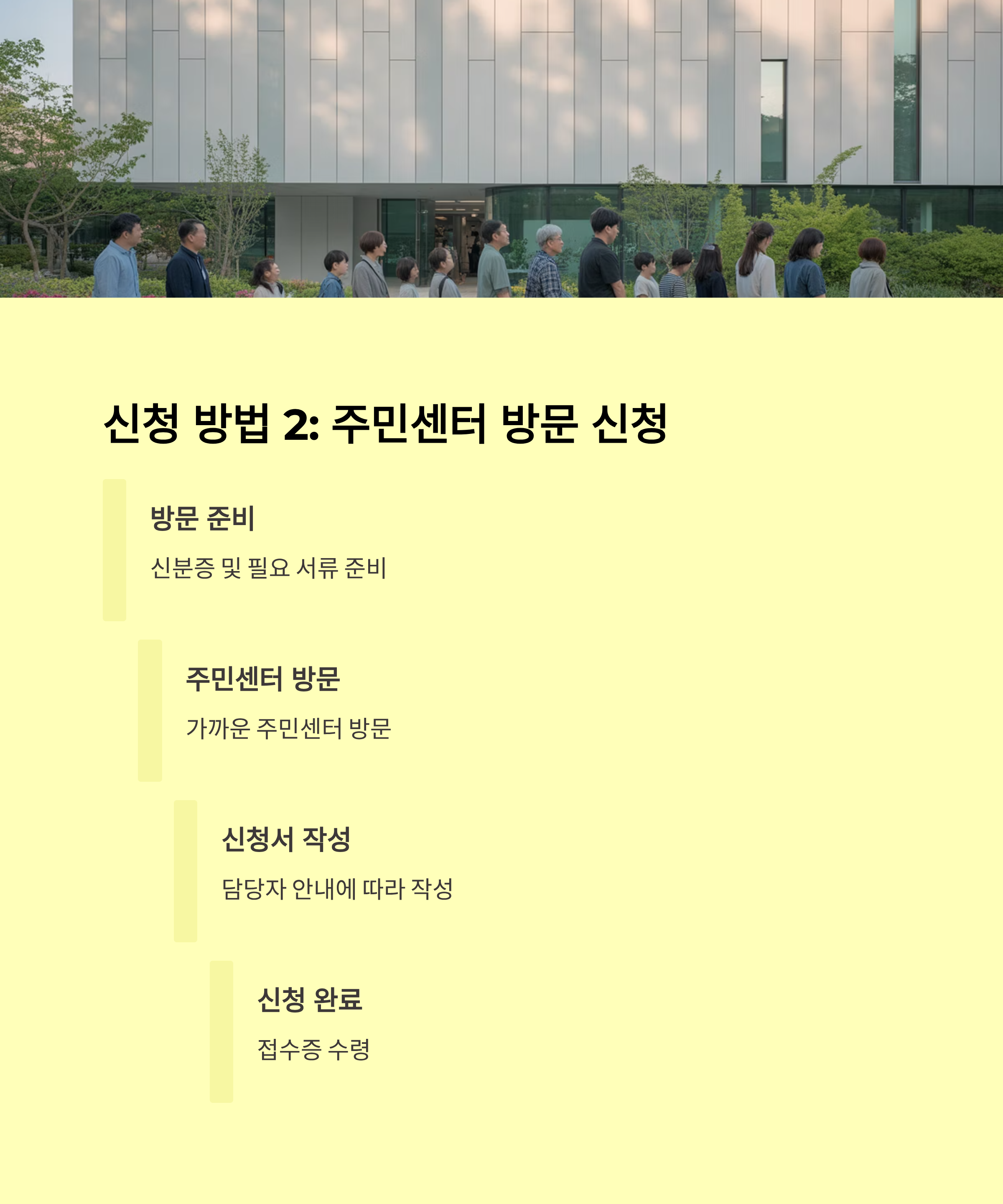 📌 오프라인 신청은 주민센터나 지정된 거점센터에 신분증을 가지고 방문해서 신청서 작성 후 접수하는 방식이에요.