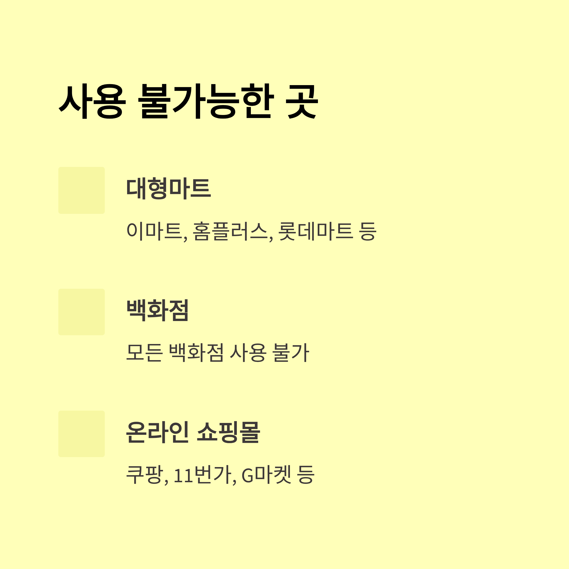 A5. 안돼요. 대형마트, 백화점, 온라인 쇼핑몰, 유흥업소 등에서는 사용 불가예요.