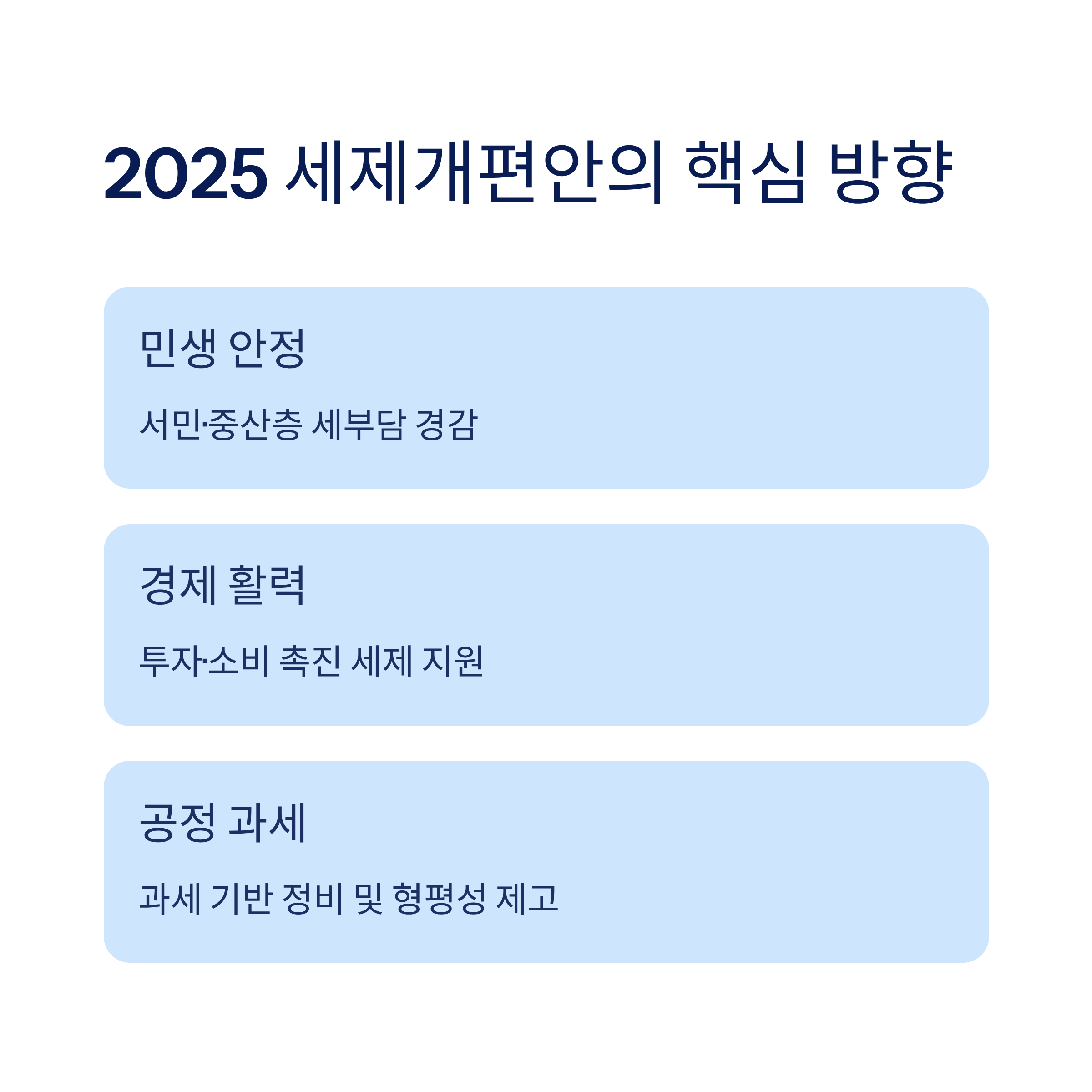 2025년 세제개편안은 "일하는 국민 세부담 완화, 기업 투자 유도, 미래 세수 기반 확대"라는 세 가지 큰 축을 중심으로 설계되었어요. 정부는 이를 통해 경제 활성화와 인구위기 대응이라는 두 마리 토끼를 잡겠다는 입장이에요.
