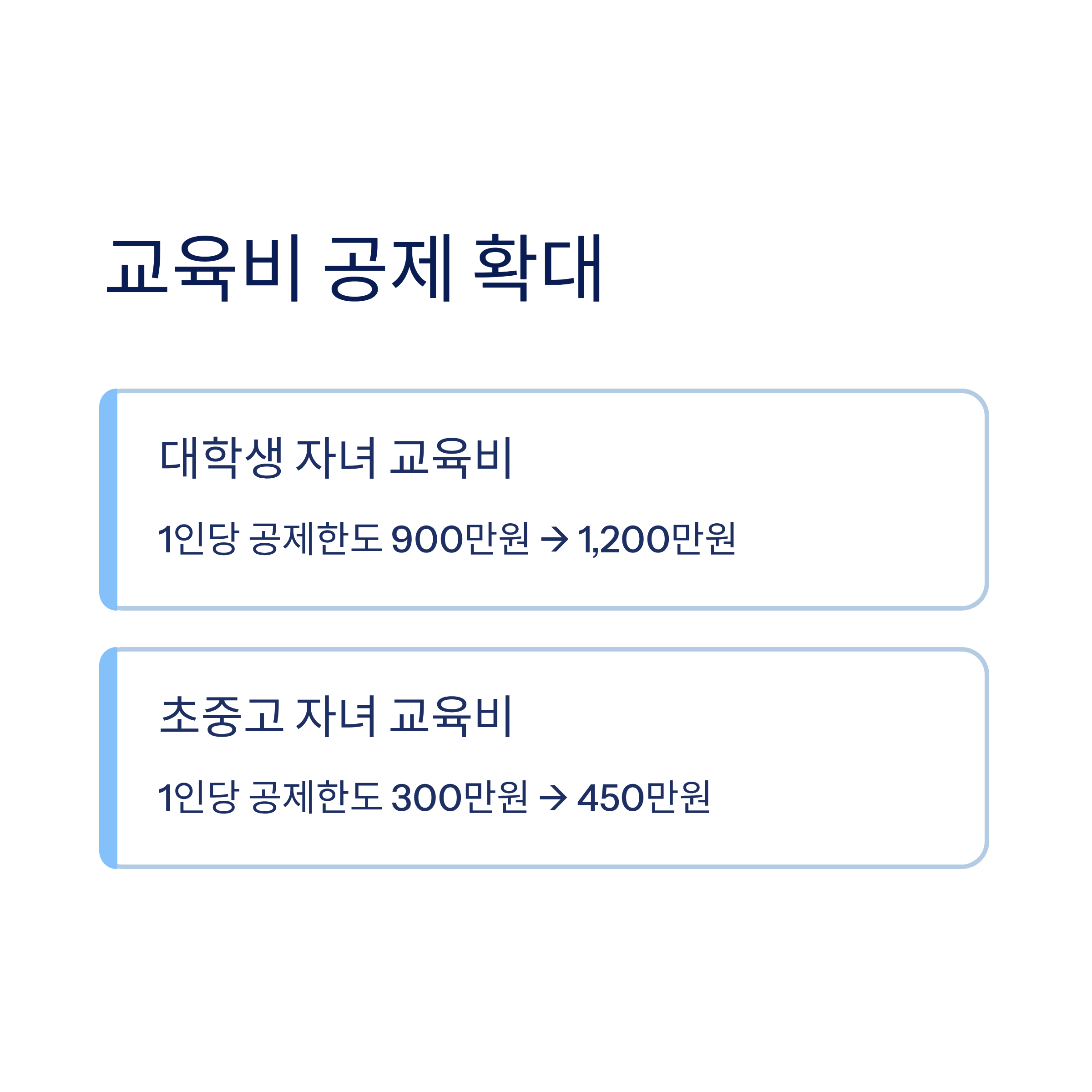 맞벌이 가구의 경우 배우자공제 요건도 완화되어 기존보다 더 많은 가정이 공제를 받을 수 있고, 육아나 돌봄 관련 공제 항목도 신설돼요. 👨👩👧👦