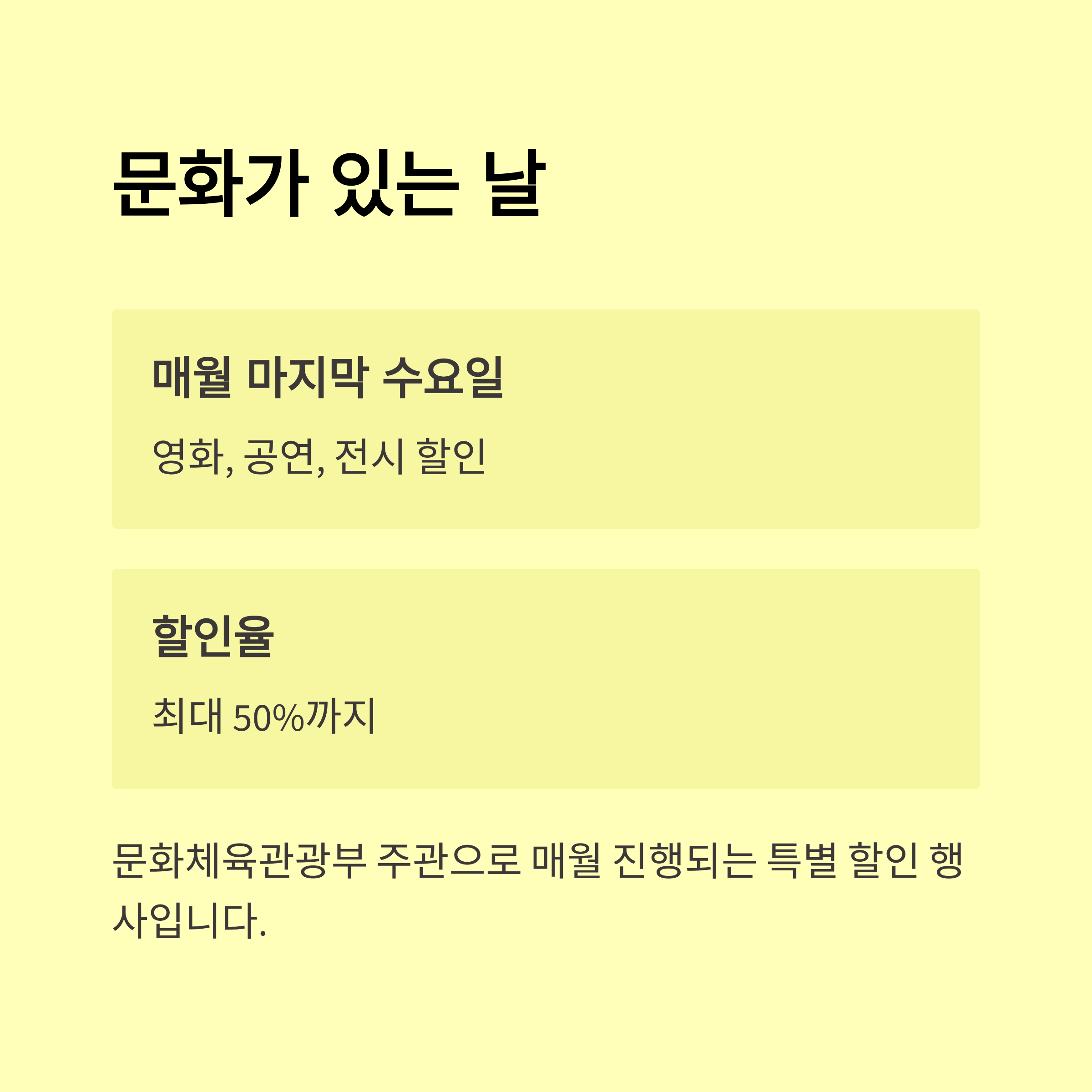 - 공연·전시 할인권은 정부, 지자체, 문화기관, 예매 플랫폼에서 제공