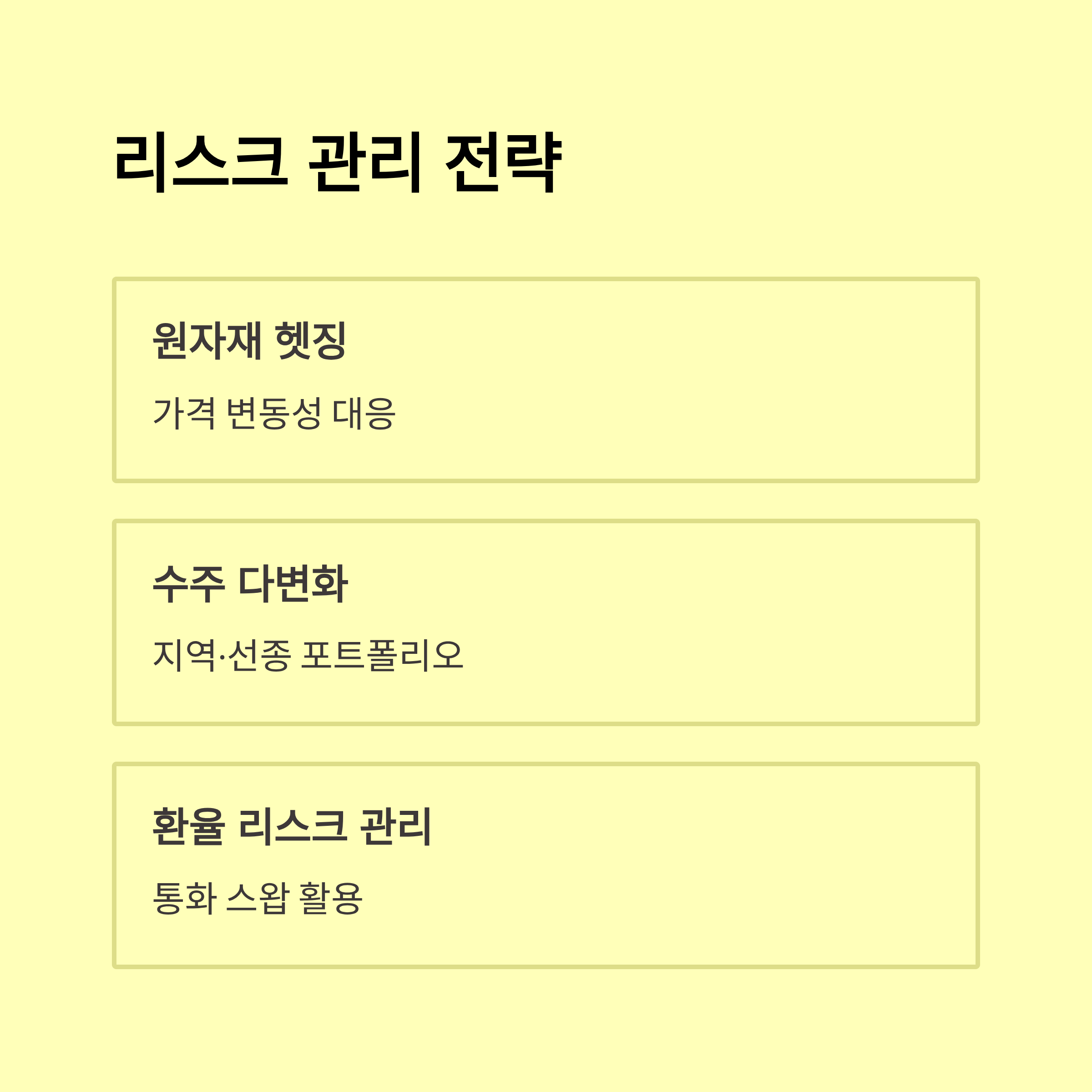- 중국 및 동남아 경쟁 심화, 글로벌 경기 침체·금융시장 불안 등 구조적 리스크