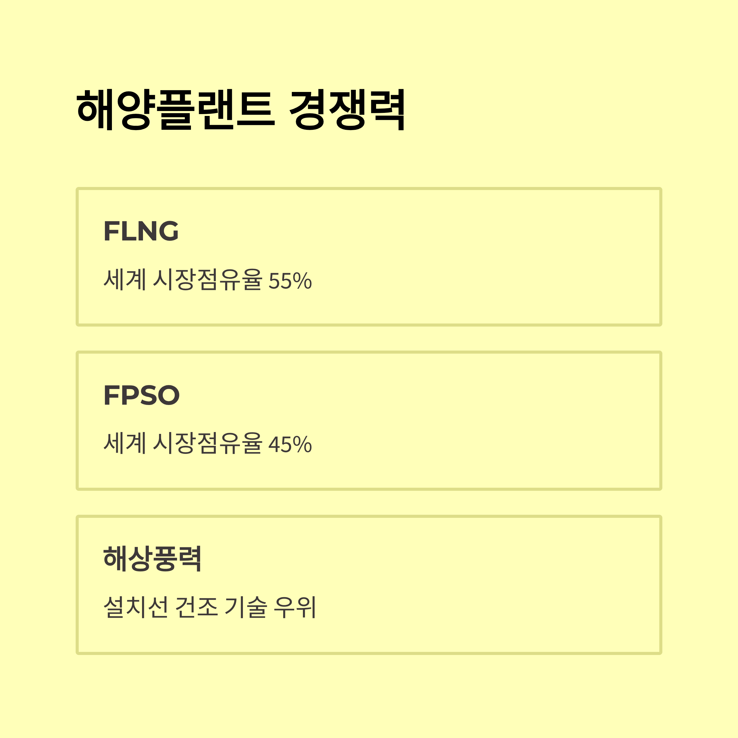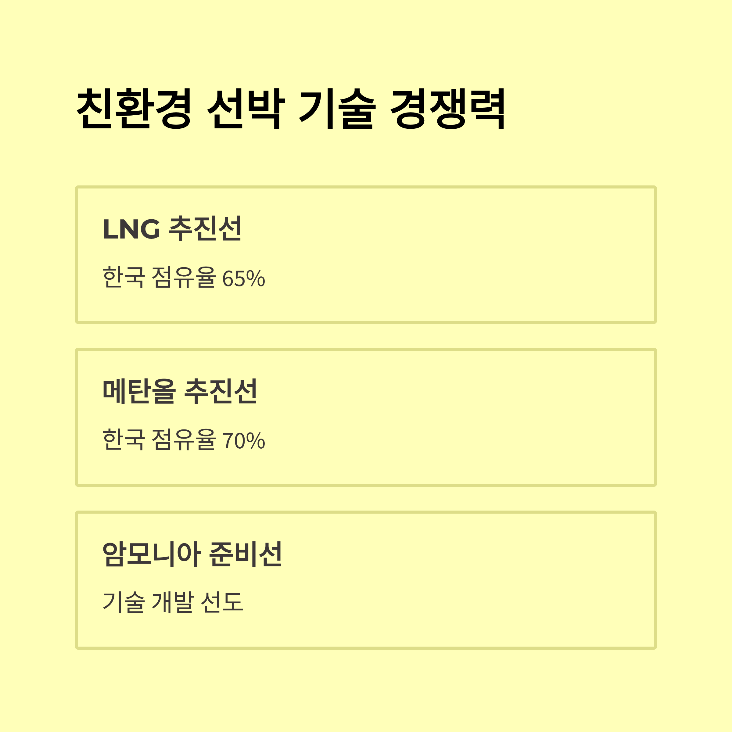 - 한국 조선사 기술력(친환경 LPG/LNG, 전기추진 선박/스마트 신조선 등)이 진입장벽으로 작동
