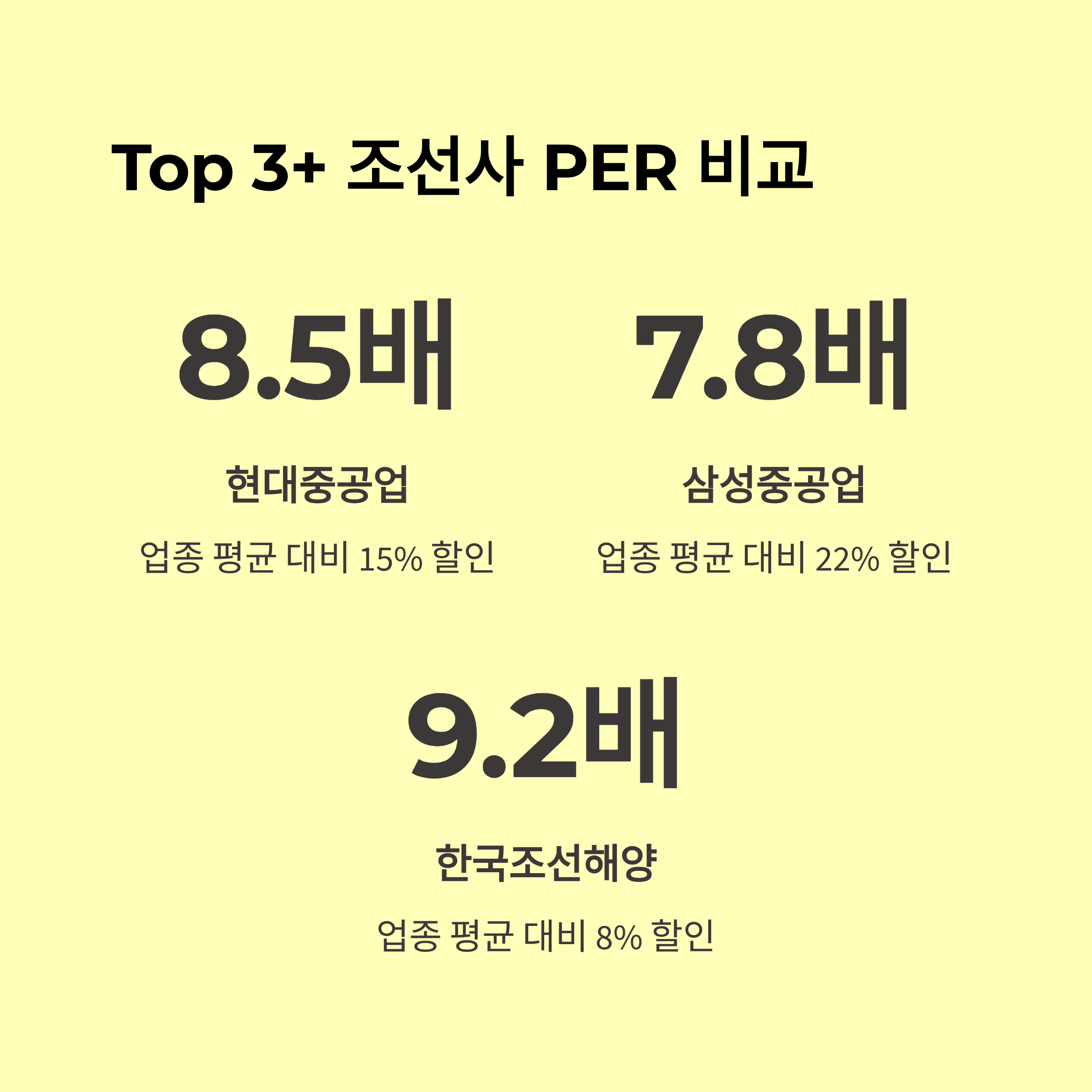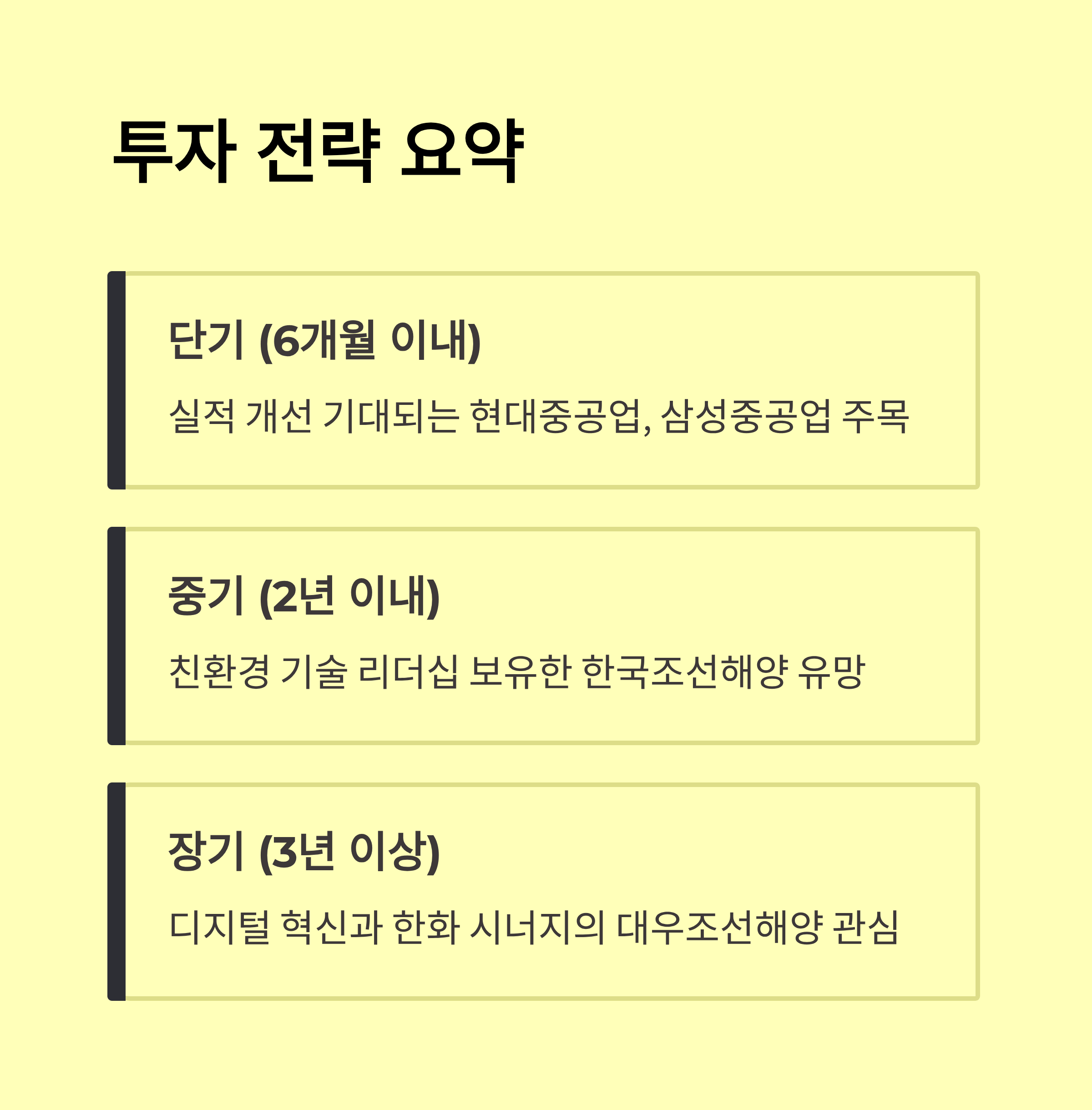 | 현대중공업 | 매출 12.7조 / 영업이익 4,200억 (전년비 +33%) | LNG·원유운반선, 신재생 플랜트, 스마트선박 확대 | 원자재·인건비 상승, 공급망 병목 |