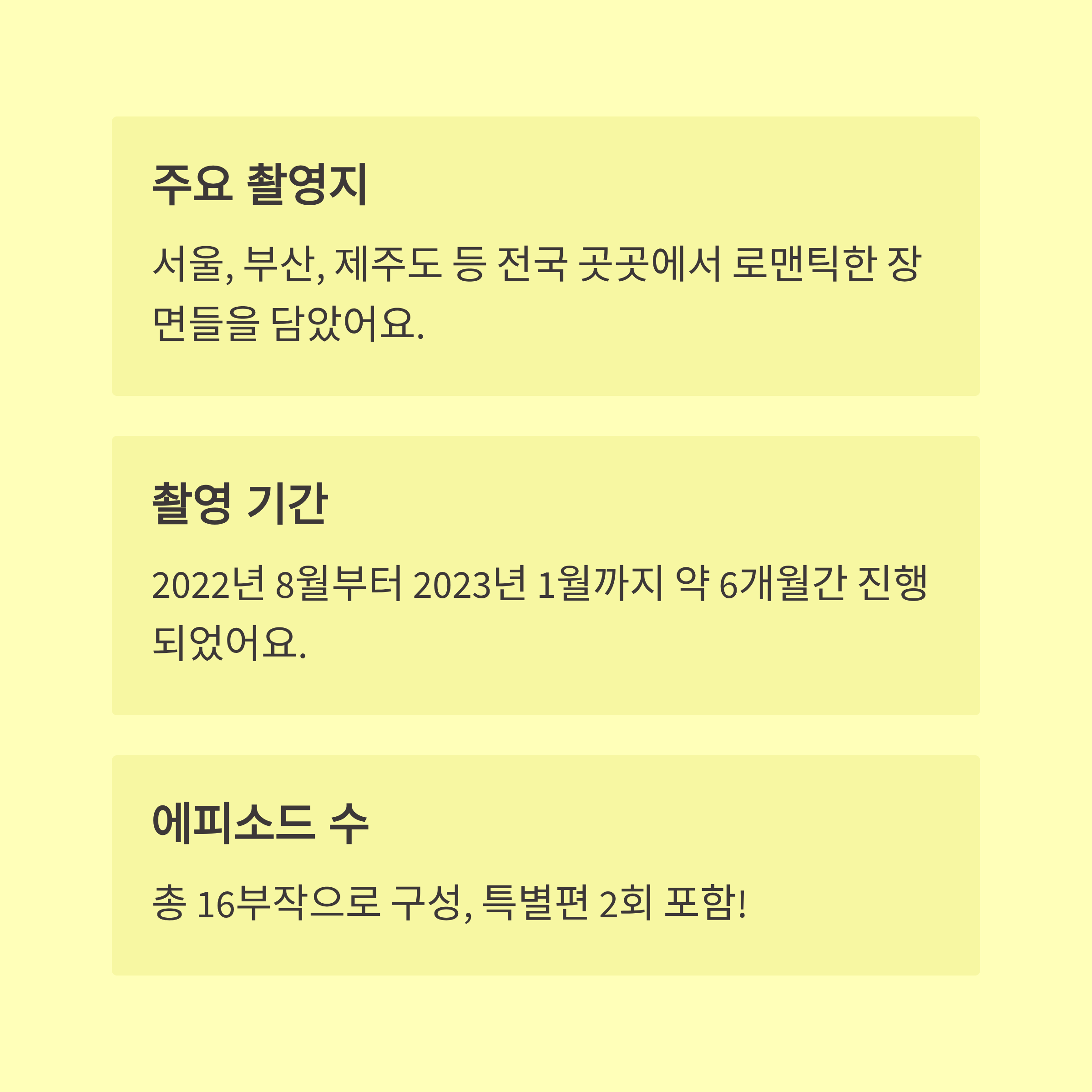 본 드라마의 주요 촬영지는 각기 특색 있는 장소들로, 드라마의 따뜻하고 포근한 분위기를 한층 더 살려줍니다.