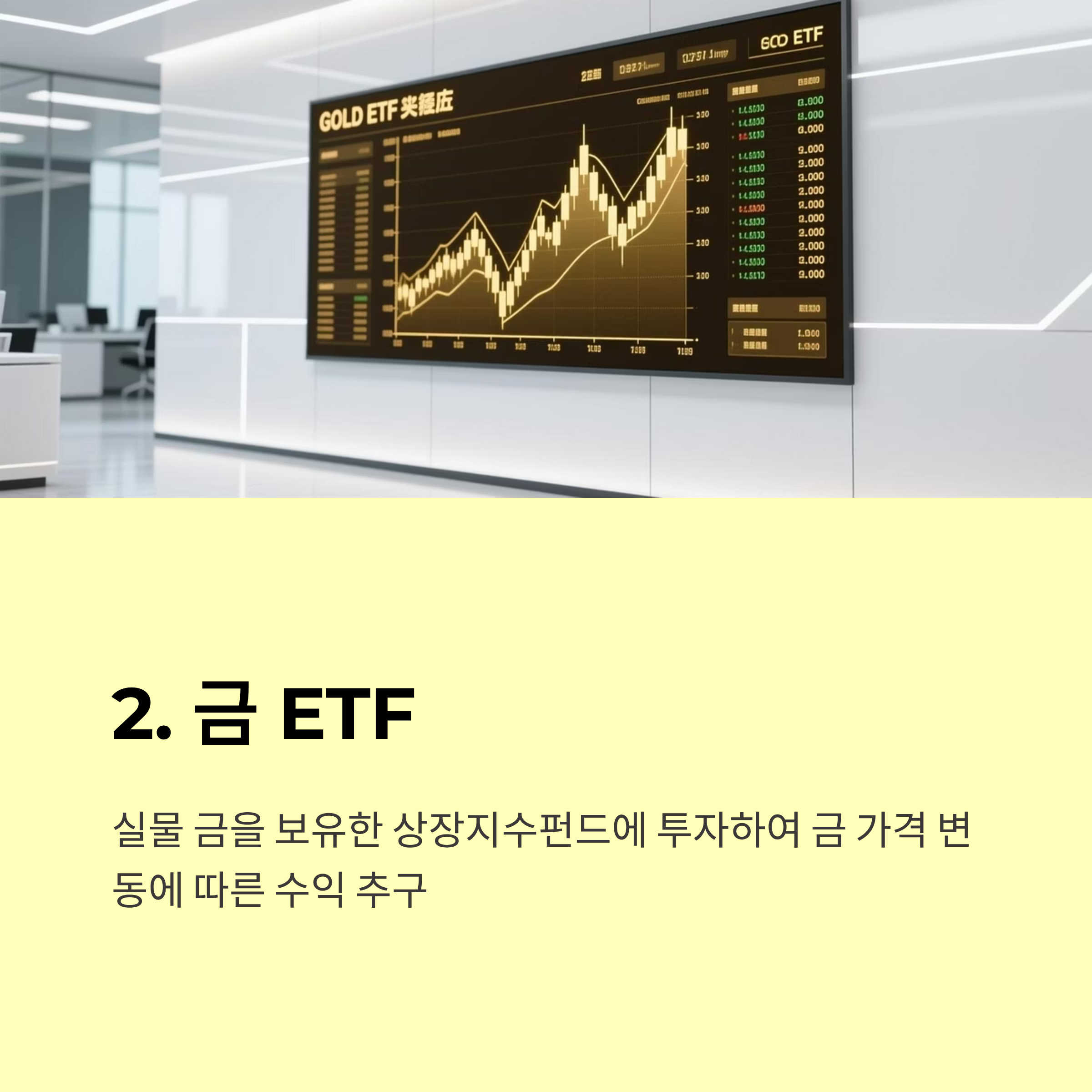 ETF는 주식처럼 금 가격에 따라 수익을 얻을 수 있는 방법이에요. 미국 SPDR 골드 ETF나 한국의 KODEX 골드선물 ETF 등이 대표적이고, 거래량도 많아서 유동성이 뛰어나요. 다만 금융상품이기 때문에 리스크가 있을 수 있어요.