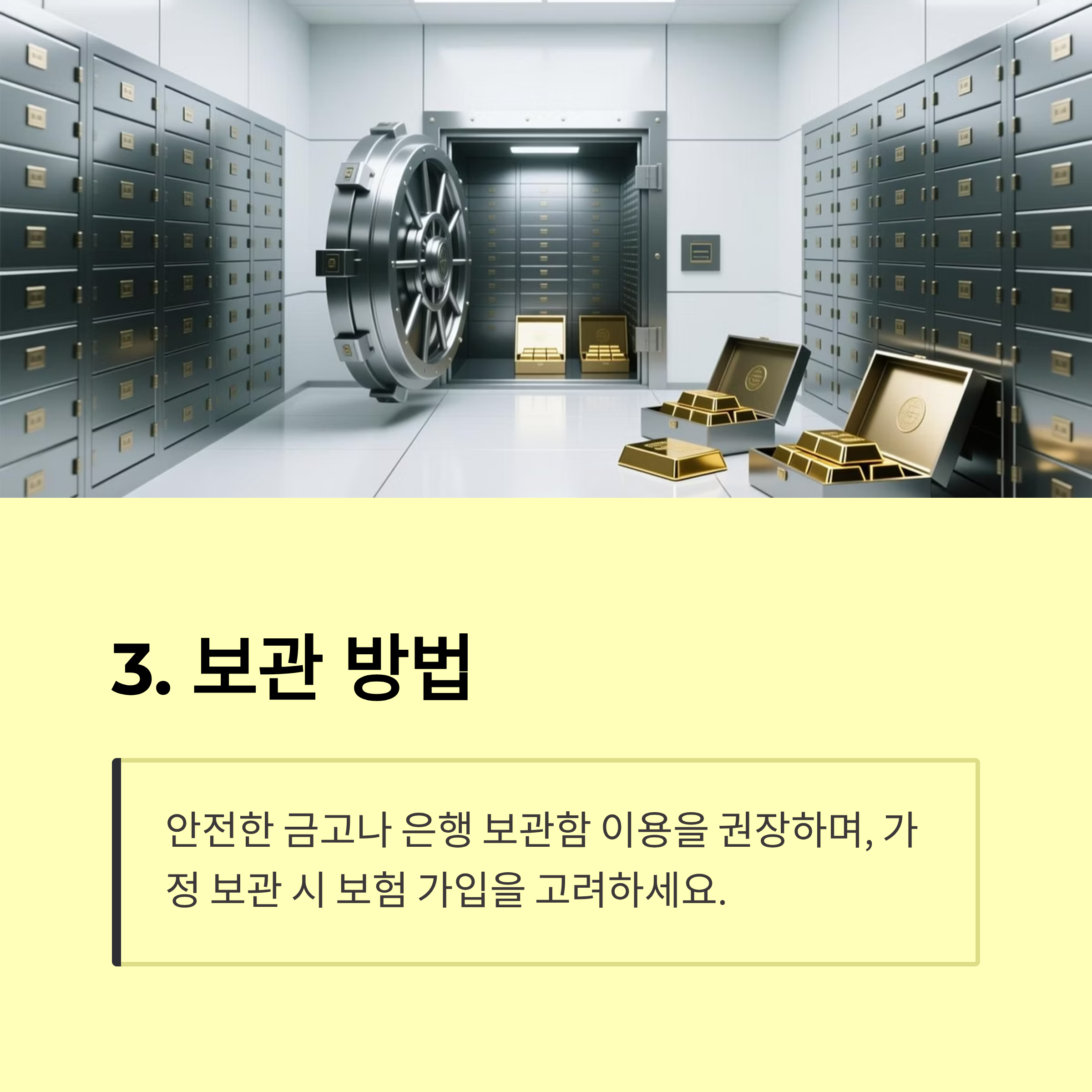 A7. 실물 금은 은행 금고, 개인 금고, 보안 업체를 이용하는 게 안전해요.