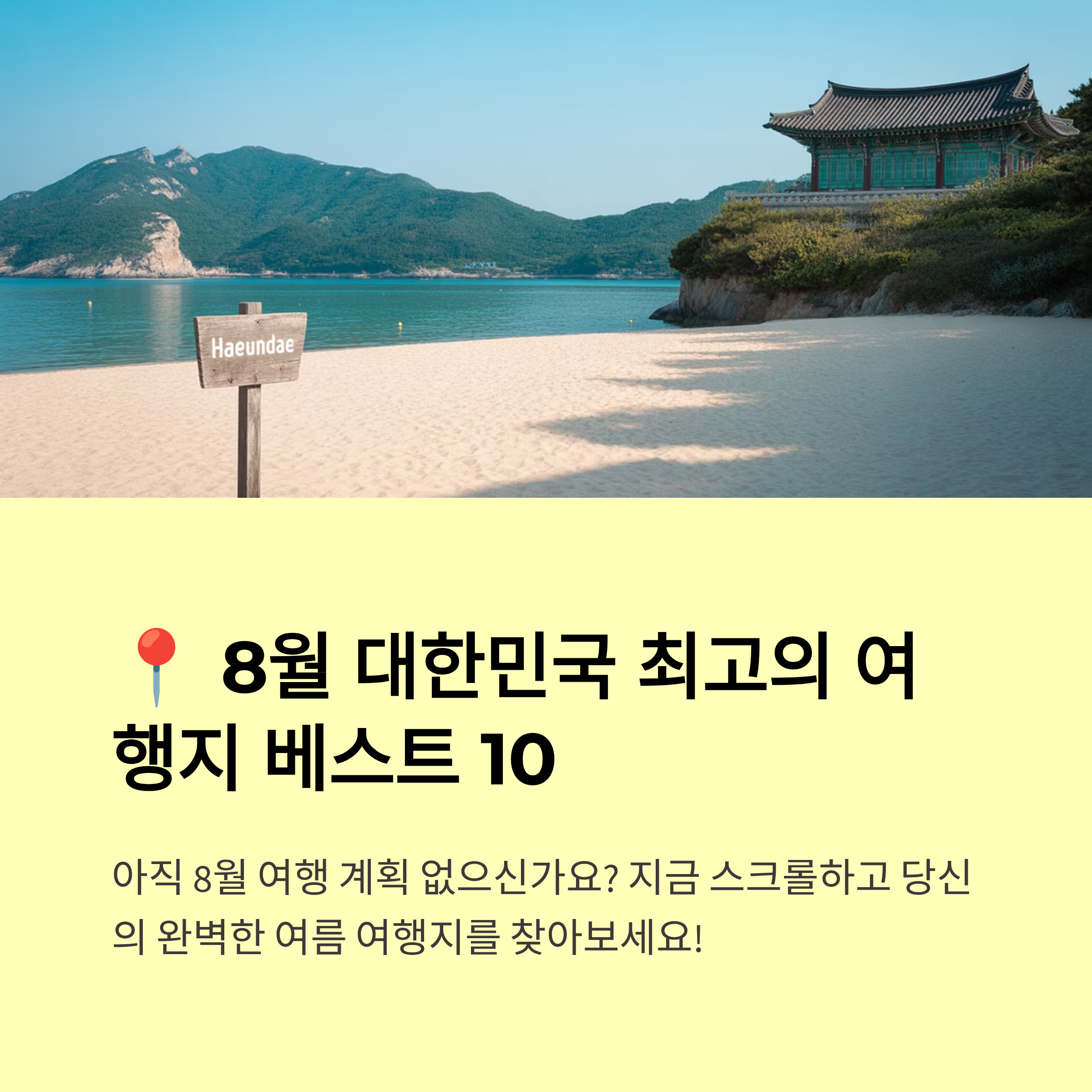 📋 목차🏖️ 8월에 꼭 가야 할 자연 여행지❄️ 무더위를 피해 떠나는 피서지🎭 역사와 문화를 느낄 수 있는 명소🌅 커플을 위한 낭만적인 여행지🌿 사람 적고 조용한 숨은 명소👨👩👧👦 가족과 함께하기 좋은 장소🚤 섬에서 즐기는 특별한 여름❓ FAQ8월은 한국에서 여름이 절정에 이르는 시기로, 무더위를 식히기 위한 피서 여행이 가장 활발한 시기예요. 이 시기엔 바다와 계곡은 물론, 시원한 산과 조용한 섬까지 다양한 여행지가 사람들로 붐비죠. 가족 여행, 커플 여행, 혼자만의 힐링 여행 등 여행의 목적에 따라 최적의 국내 명소가 달라질 수 있어요. 그래서 이번엔 8월에 가면 좋은 국내여행지 10곳을 테마별로 소개해볼게요. 내가 생각했을 때, 이 리스트는 자연, 문화, 가족, 커플 등 다양..