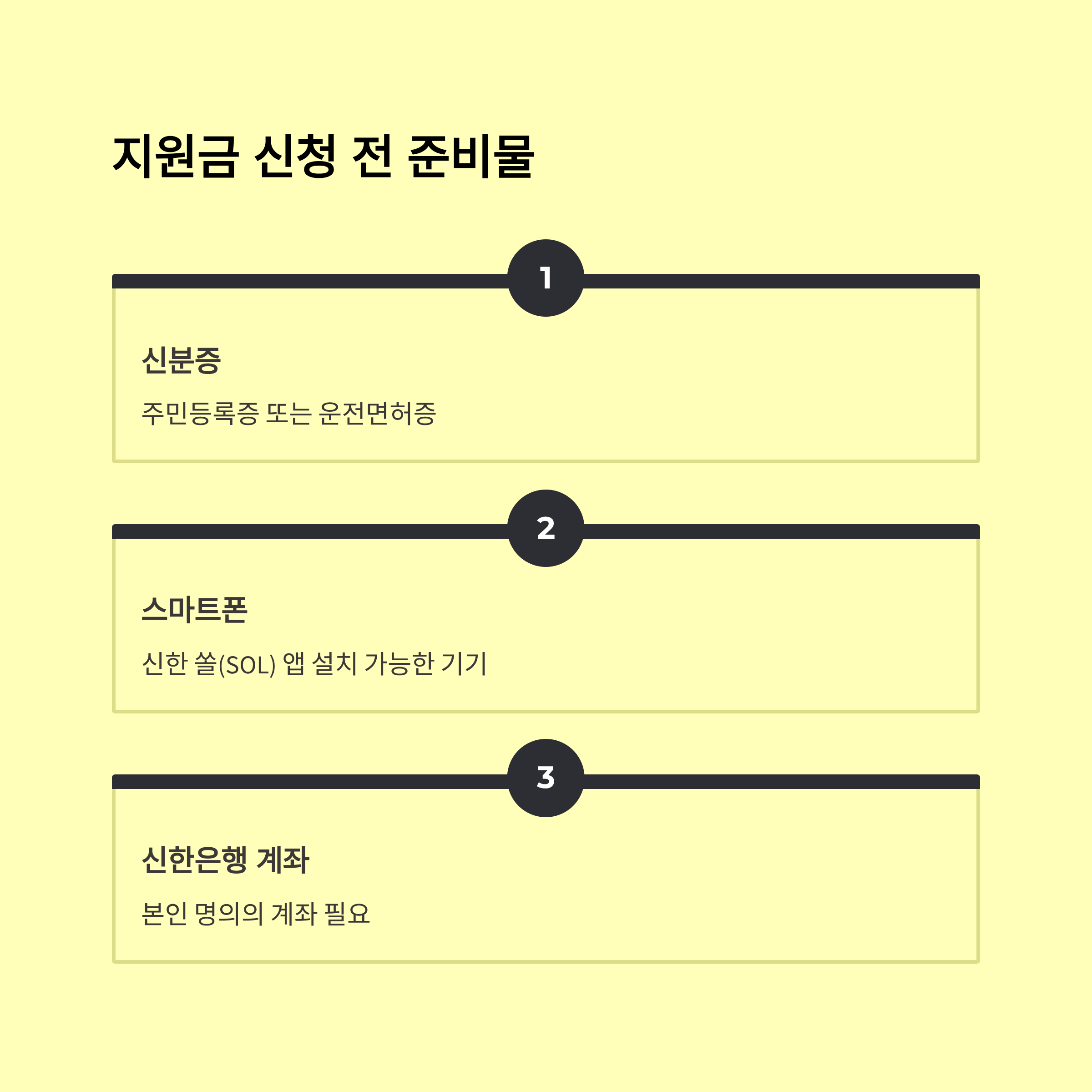 - 필수 준비물: 본인 신분증(주민등록증, 운전면허증 등)과 지원금을 충전할 본인 명의의 신한 신용/체크카드.