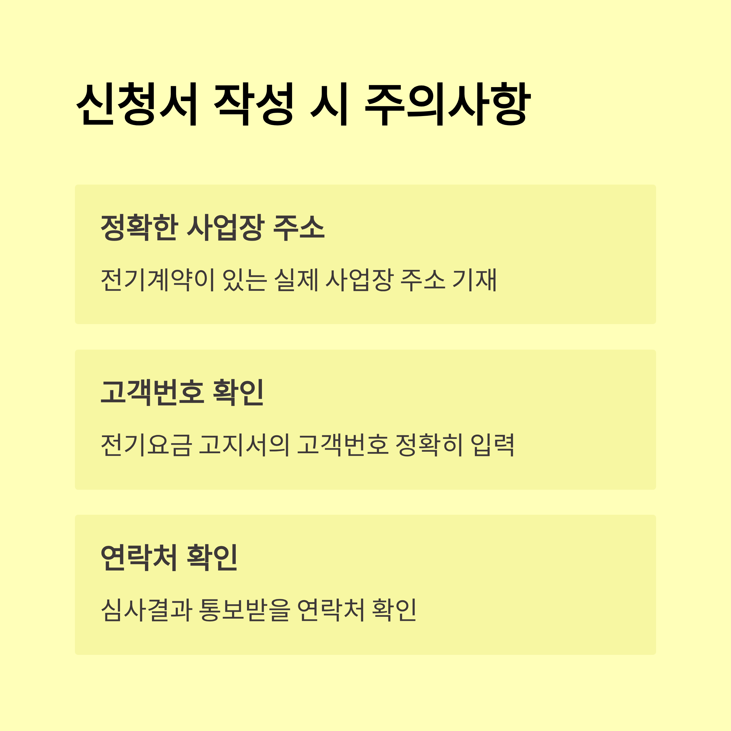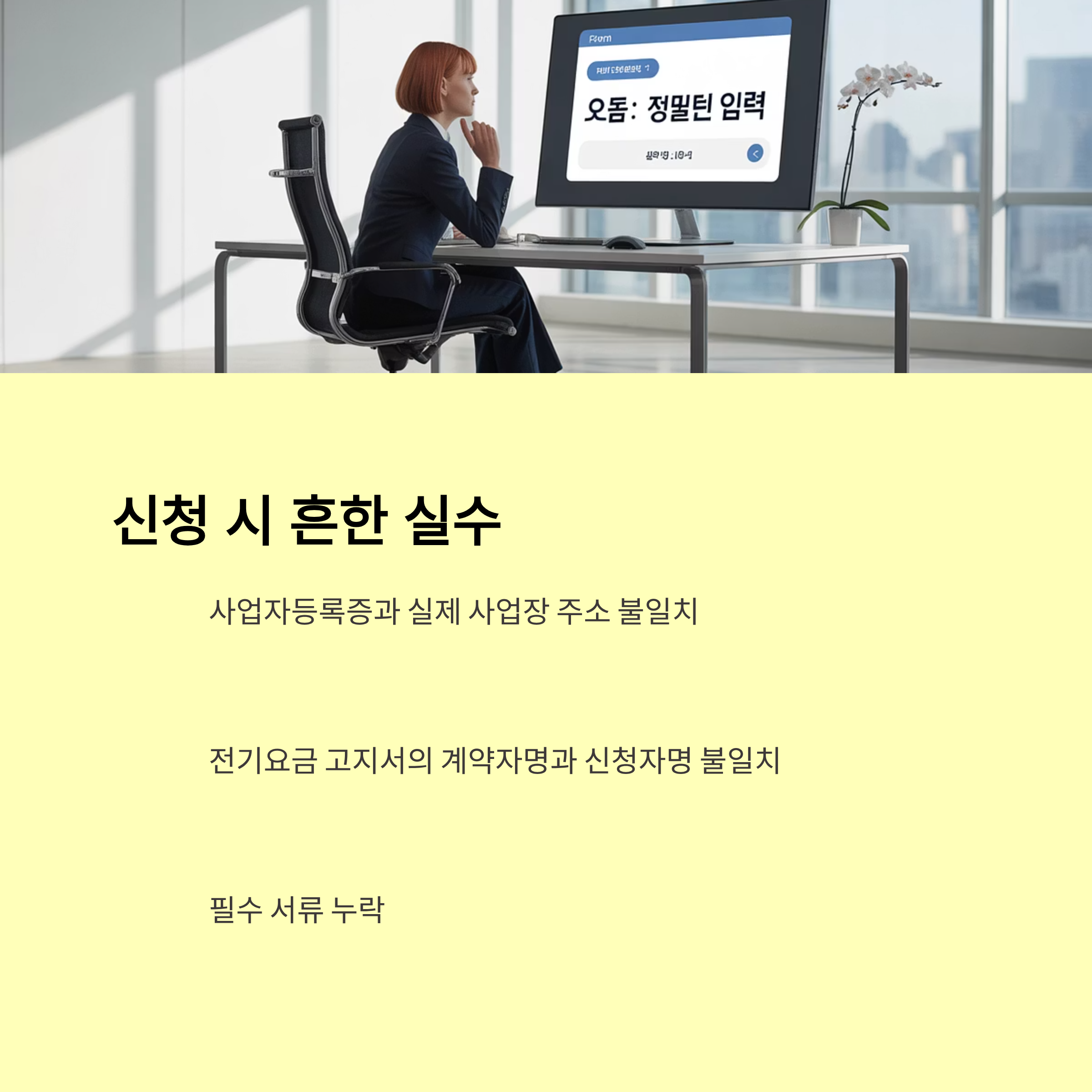 사업자등록번호 또는 고객번호를 잘못 입력하거나 서류 미첨부인 경우가 많습니다. 전기요금 고지서의 고객번호를 사전에 꼼꼼히 확인하고, 빠짐없이 서류를 제출해 주세요.