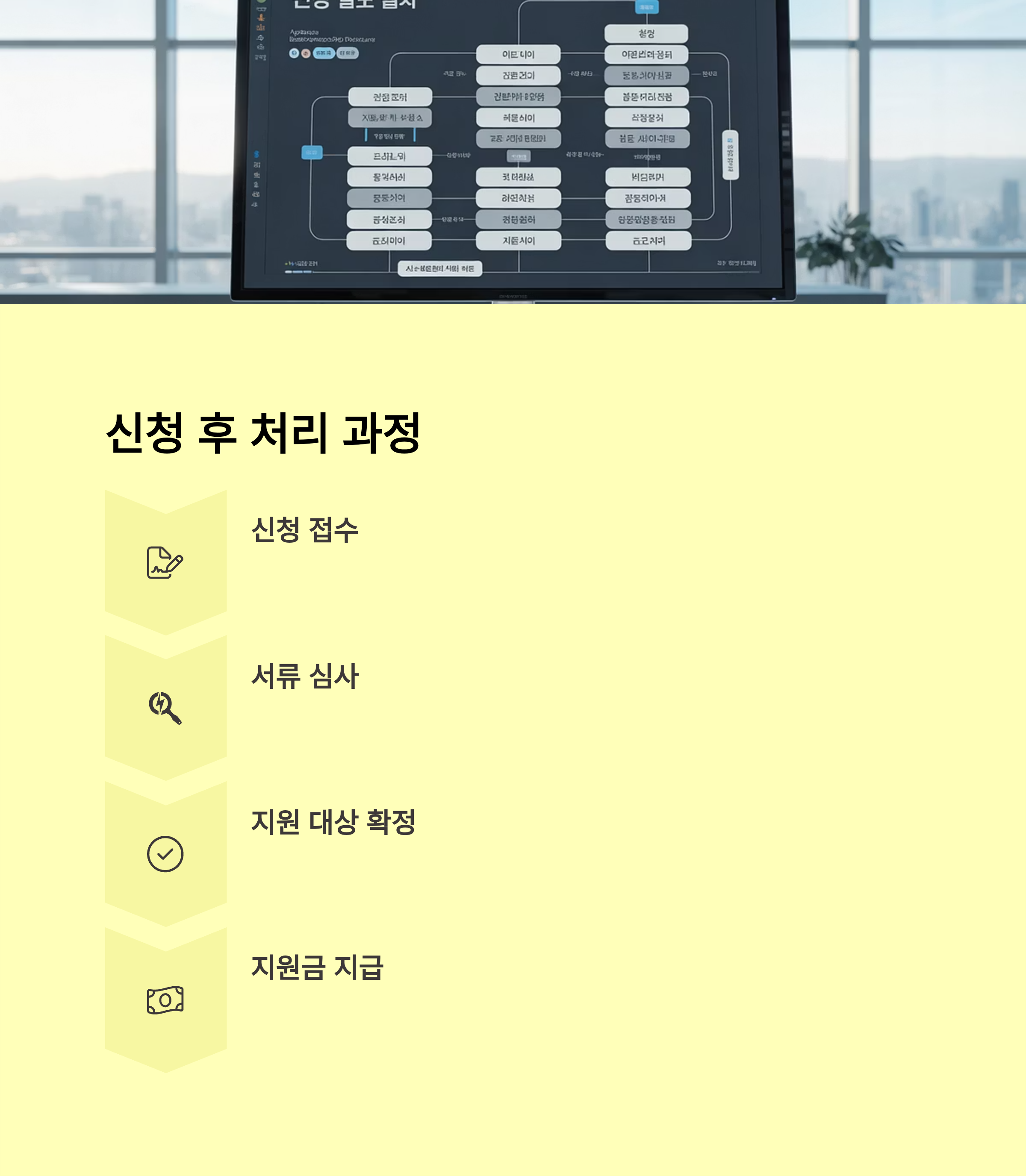 신청 전 간단한 자가진단을 통해 지원 자격을 다시 한번 점검합니다. 필요 시 대표자 위임장 등 추가 서류를 업로드합니다. - 신청 완료 및 심사 결과 확인