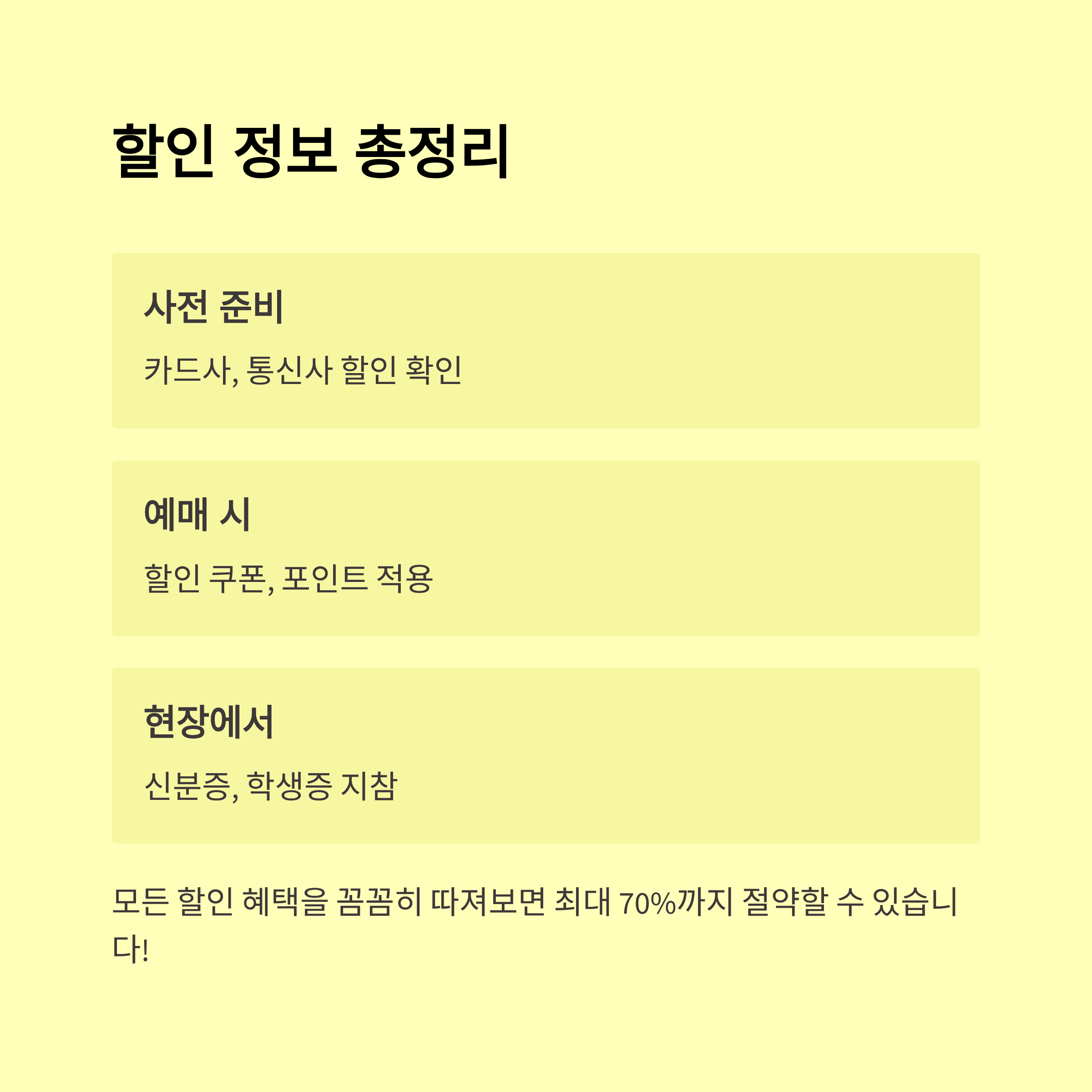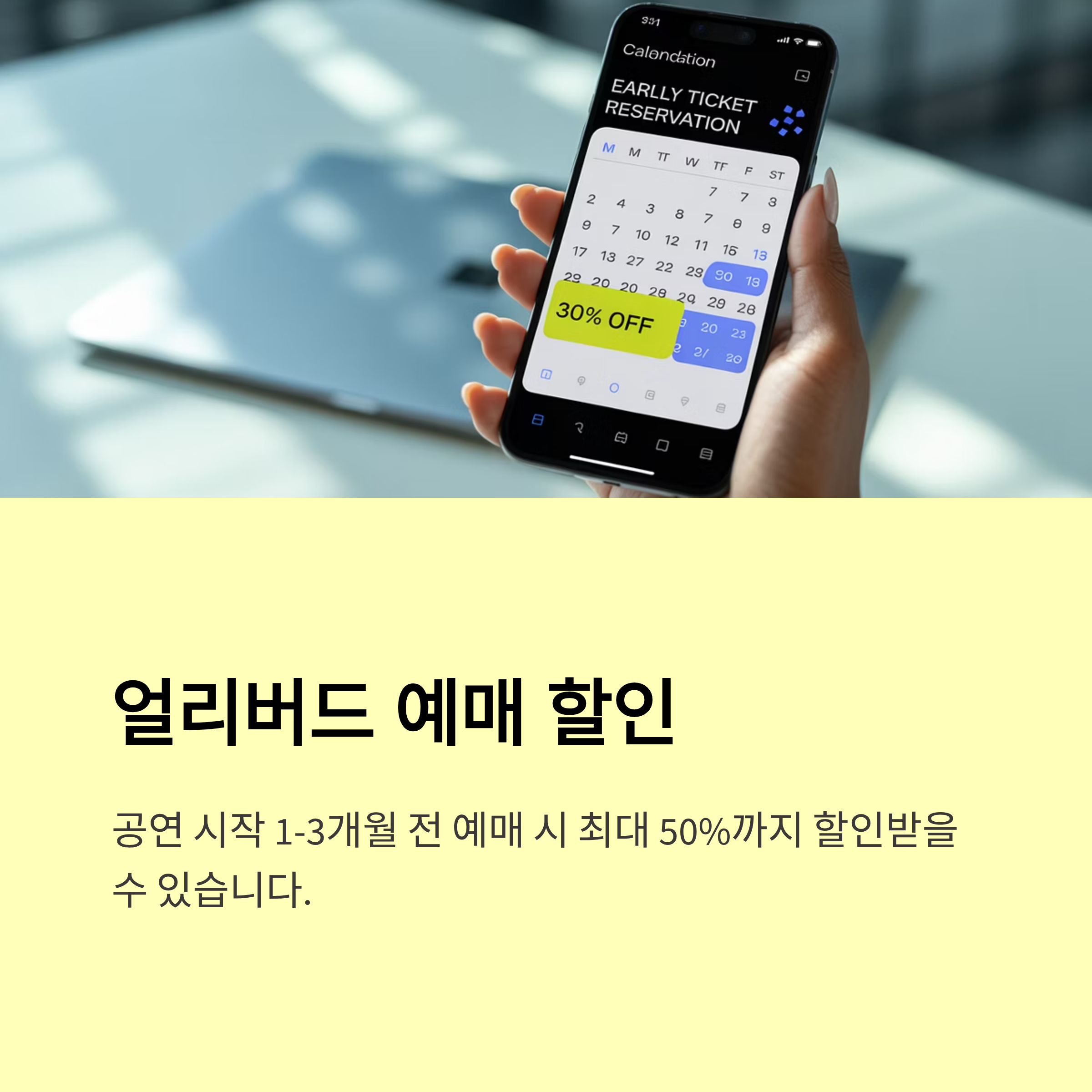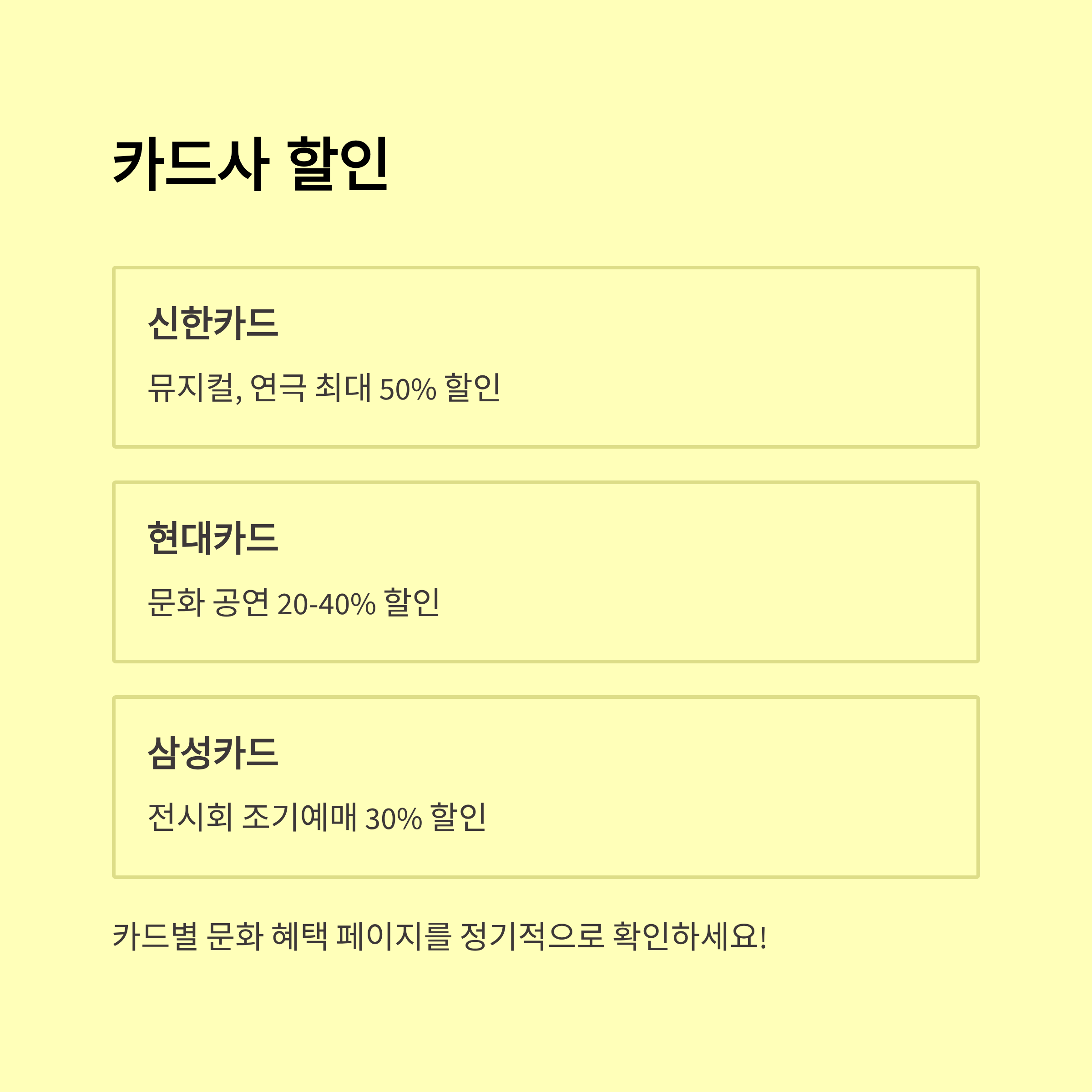 - 예매플랫폼(인터파크, 네이버, 예스24 등) 쿠폰 – 신규가입, 시즌 할인, 포인트 적립 이벤트