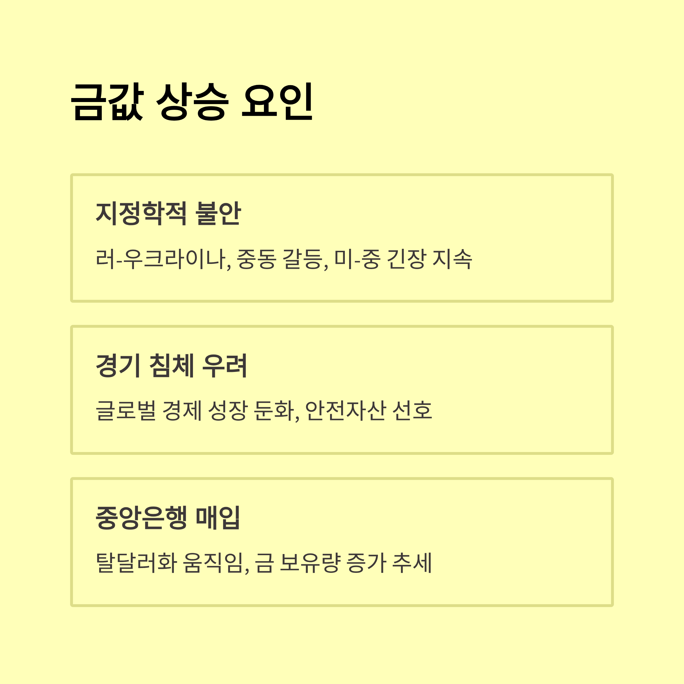 A. 달러·채권 불안, 글로벌 경제 리스크, 지정학적 위기 반복, 중앙은행 매입 확대 등으로 구조적 상승세가 유지되어 왔습니다.