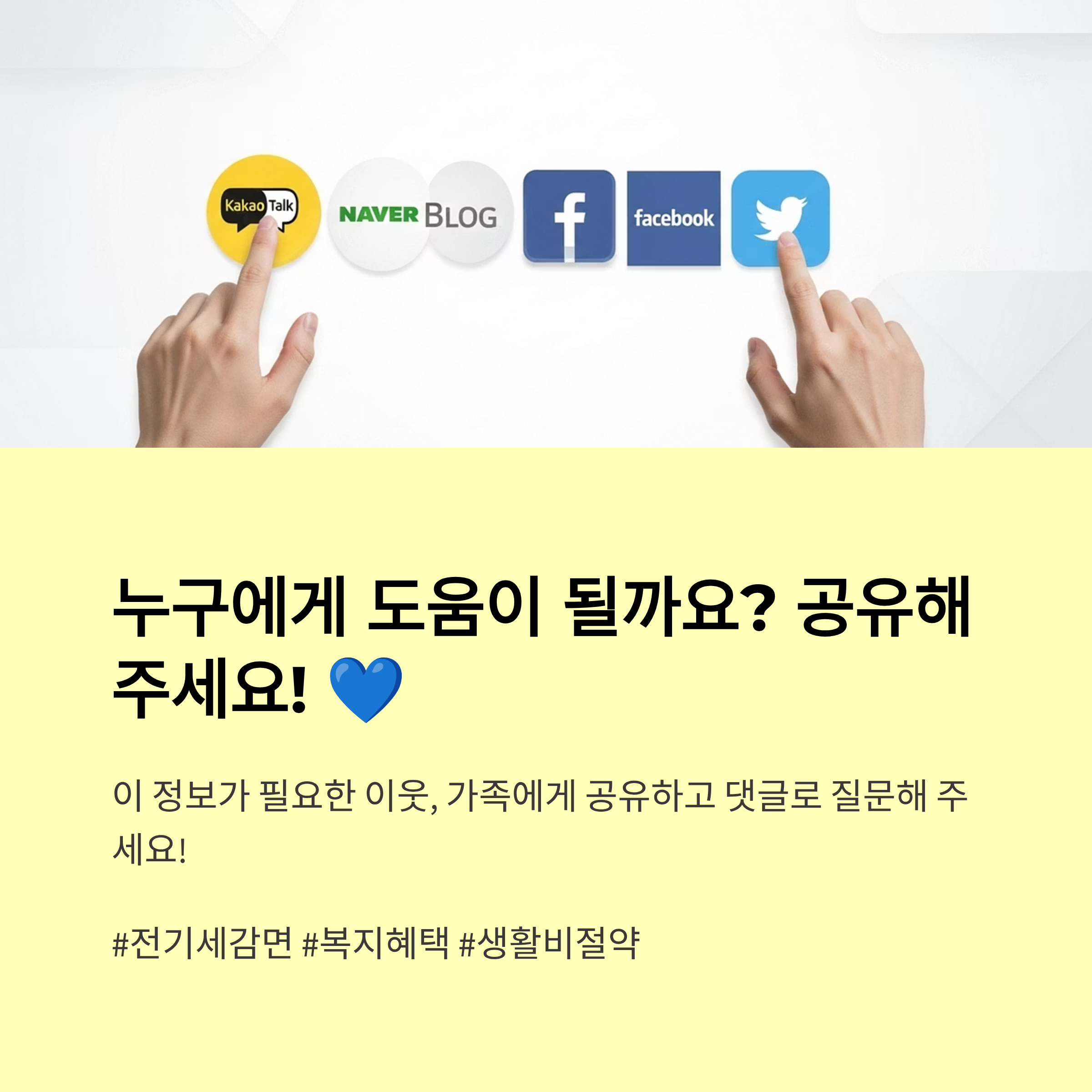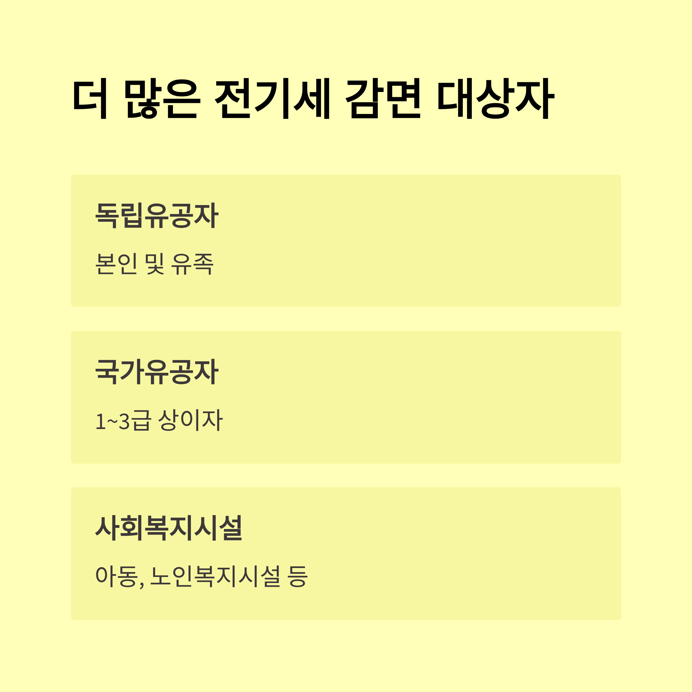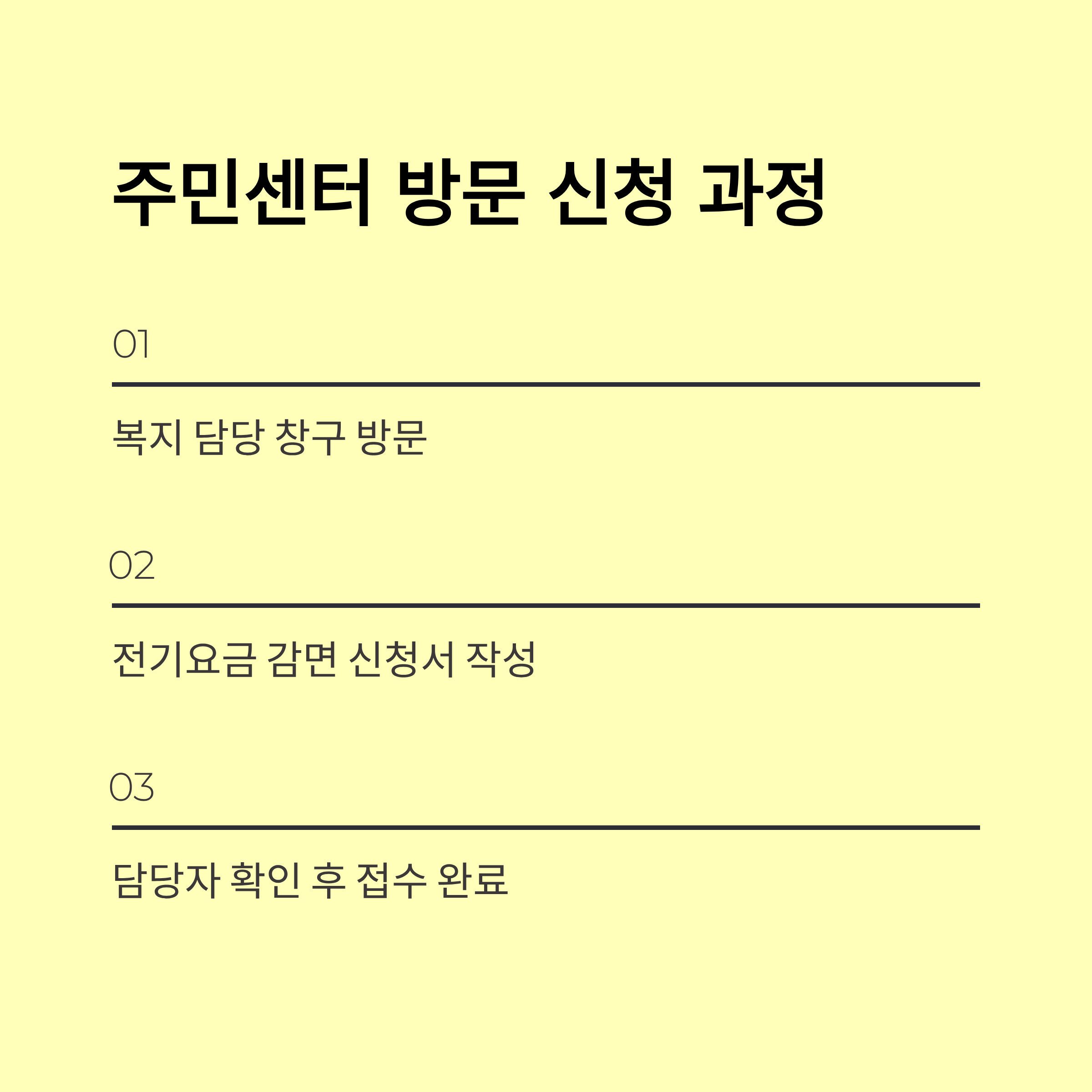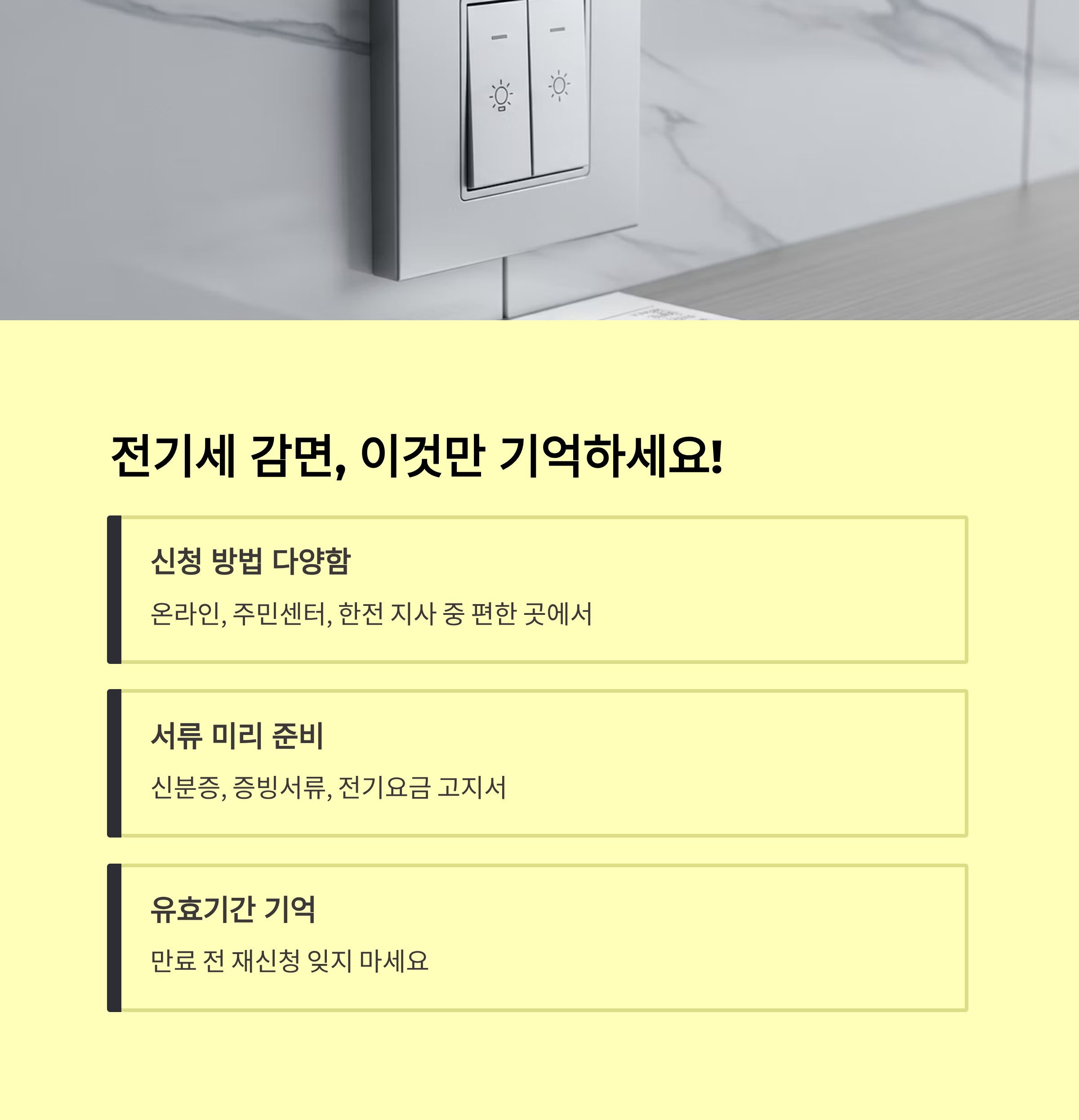 - 오프라인: 주민센터/동사무소 방문, ‘전기요금 감면 신청서’·증빙서류 제출