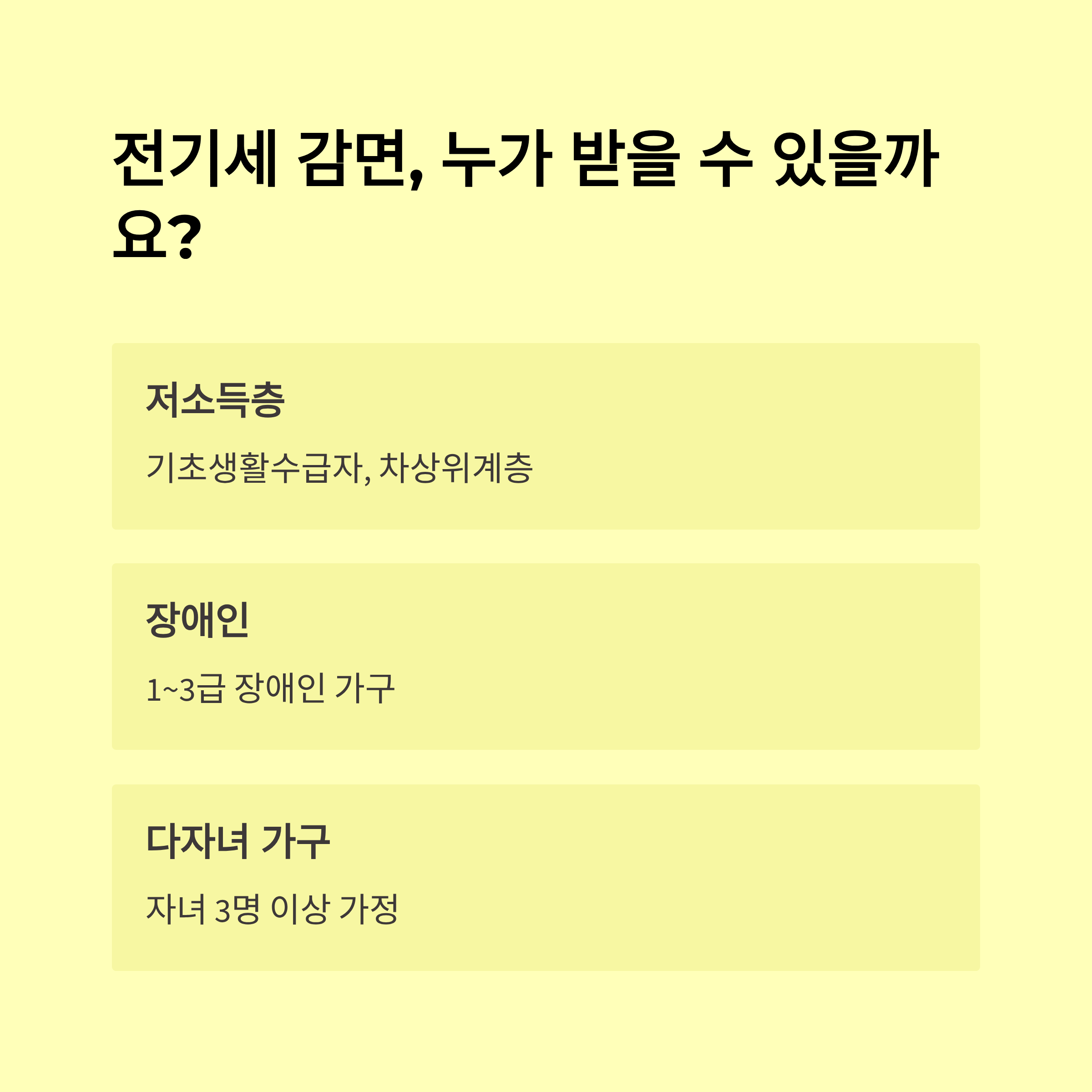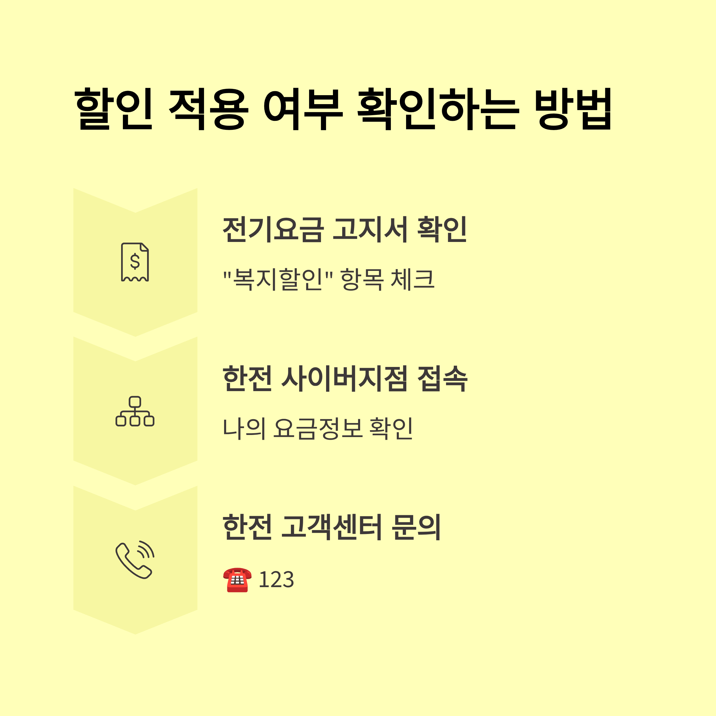 - 자격확인 한국전력(한전) 홈페이지 '요금감면 자격 확인' 메뉴 / 복지로 자가진단 / 주민센터 상담