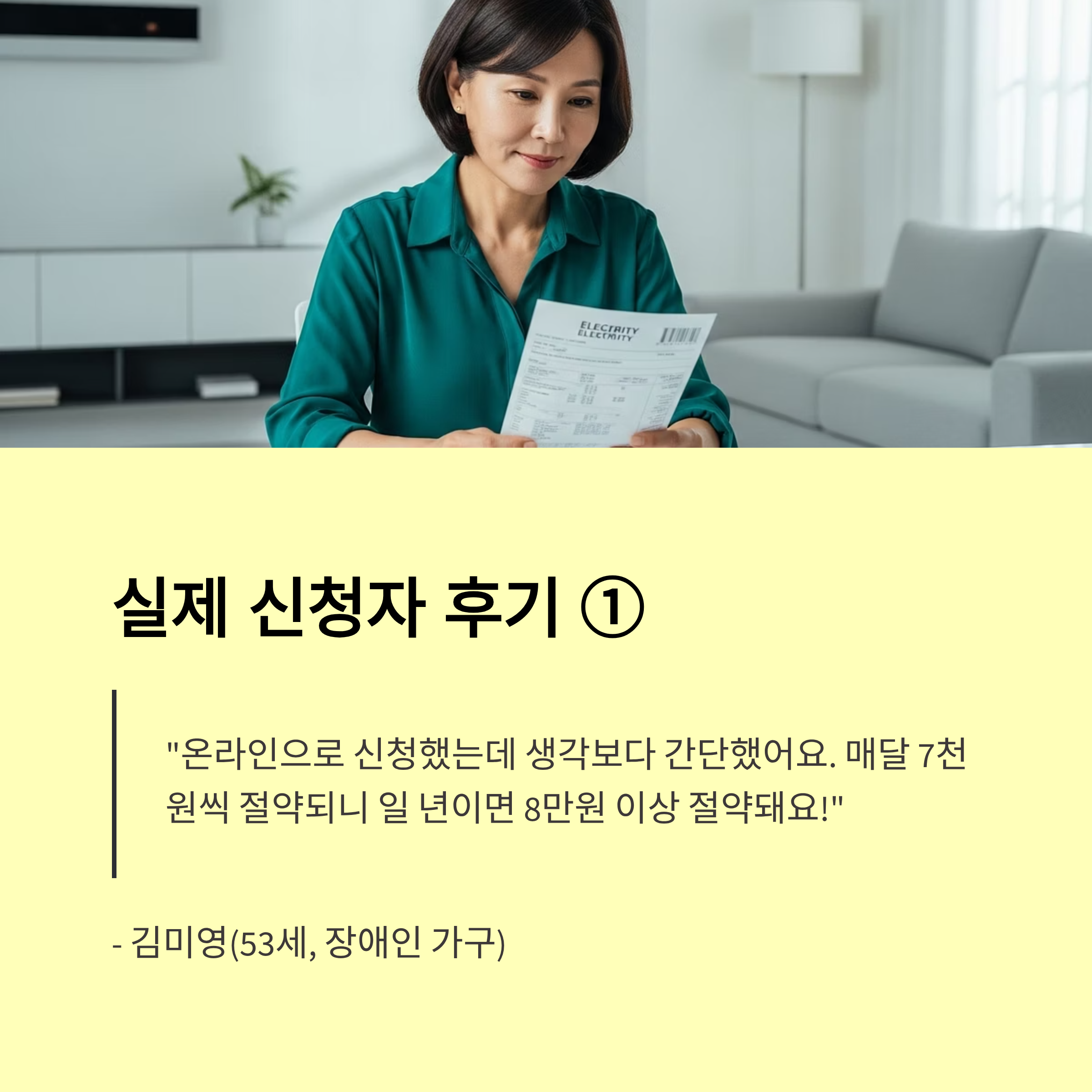 “지난 5월 한전 앱으로 사진만 올려 3일 만에 감면 신청 승인. 다음달 고지서에서 약 12,000원 깎여서 크게 실질 도움. 생각보다 간단했고, 쇼핑몰에서 환급받는 것보다 더 빠르고 쉽더군요.”