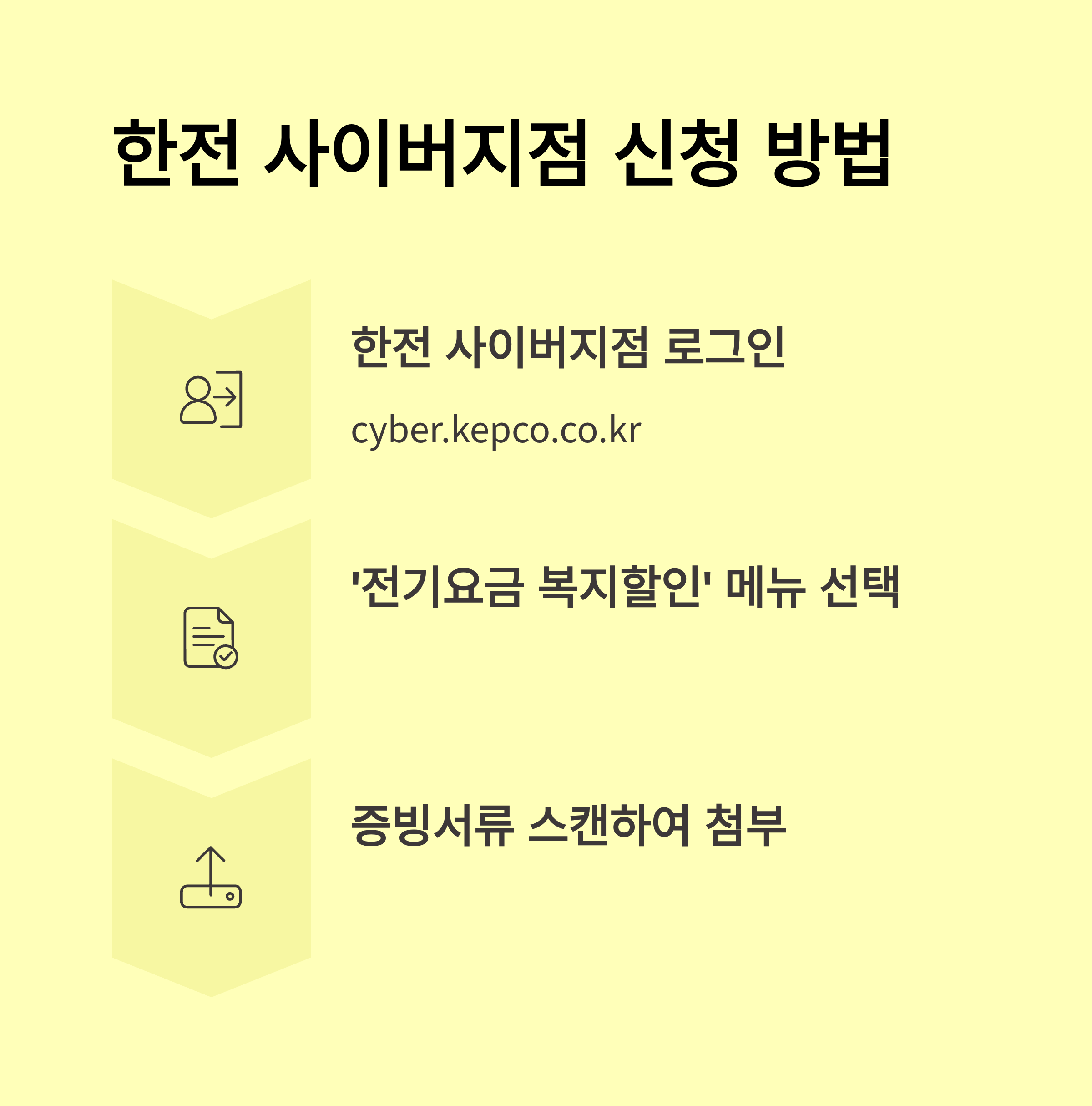 - 온라인: 한전(https://www.kepco.co.kr) 또는 복지로(https://www.bokjiro.go.kr) 접속, 본인인증/회원가입, 감면신청 메뉴 이용