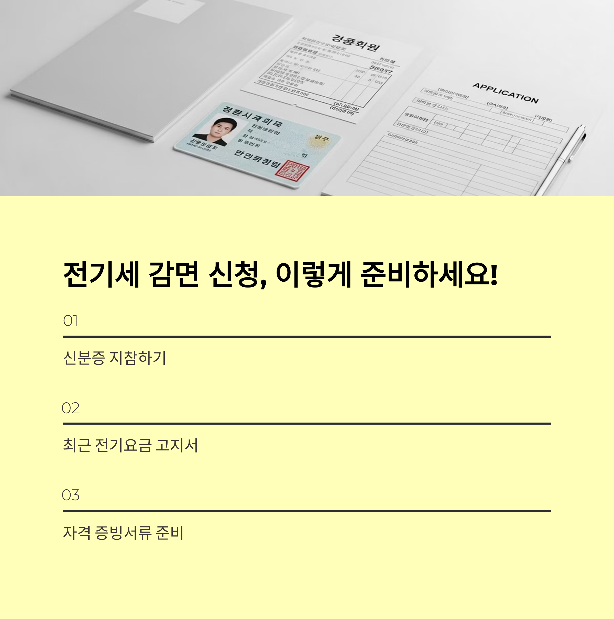 - 필수서류 준비 - 신분증, 가족관계증명서(다자녀가구), 기초생활수급·장애인·국가유공 증명서 - 전기요금 고지서(청구서) 또는 고객번호 확인