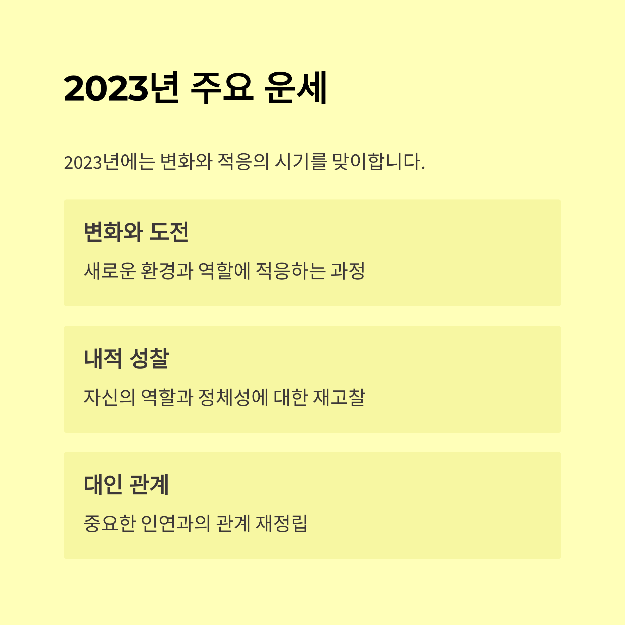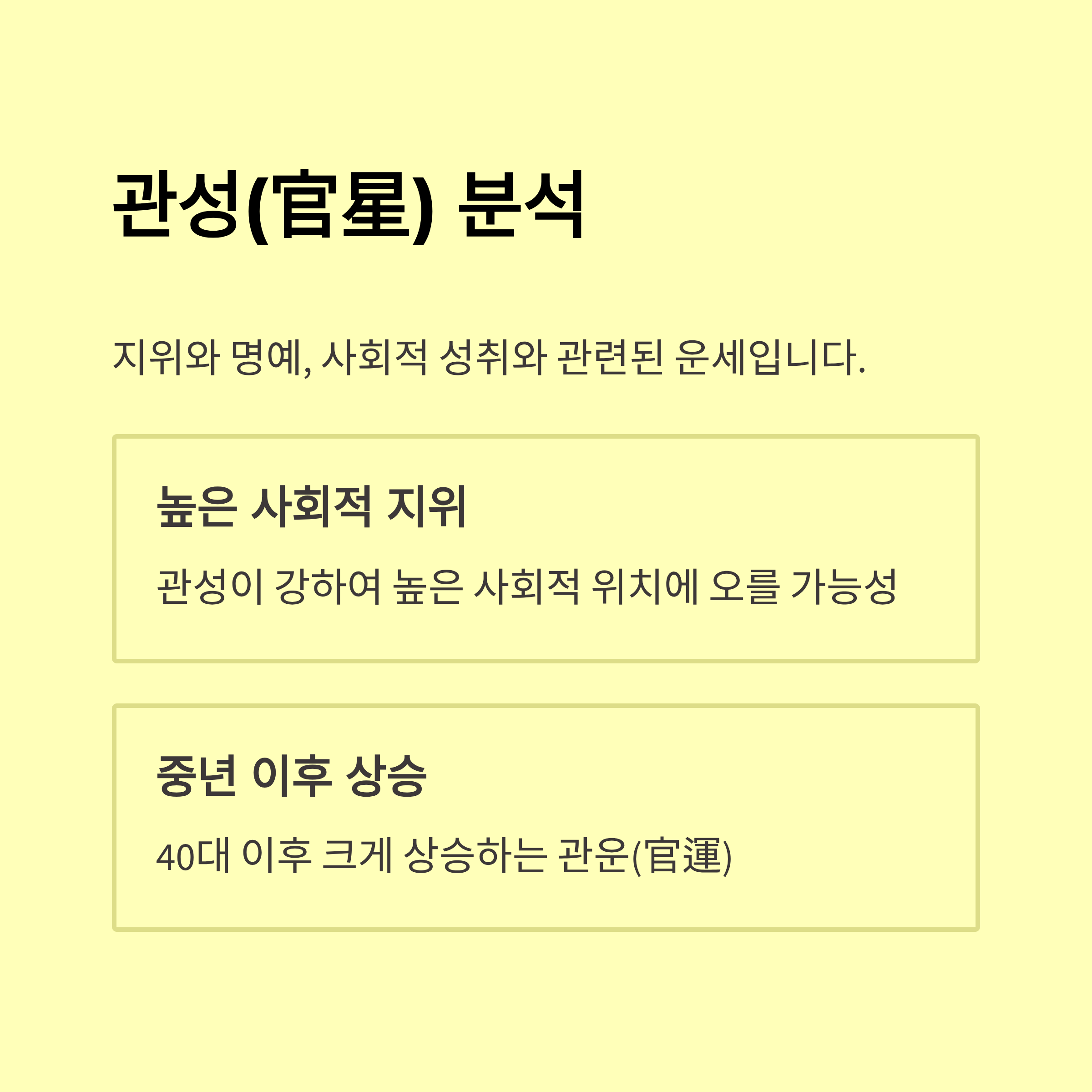 또한 재물 운이 강한 편이라, 자산 관리 능력이 뛰어납니다. 다만, 투자나 사업 확장 시에는 주변 조언을 듣는 것이 안정적인 결과를 만드는 데 도움이 돼요.
