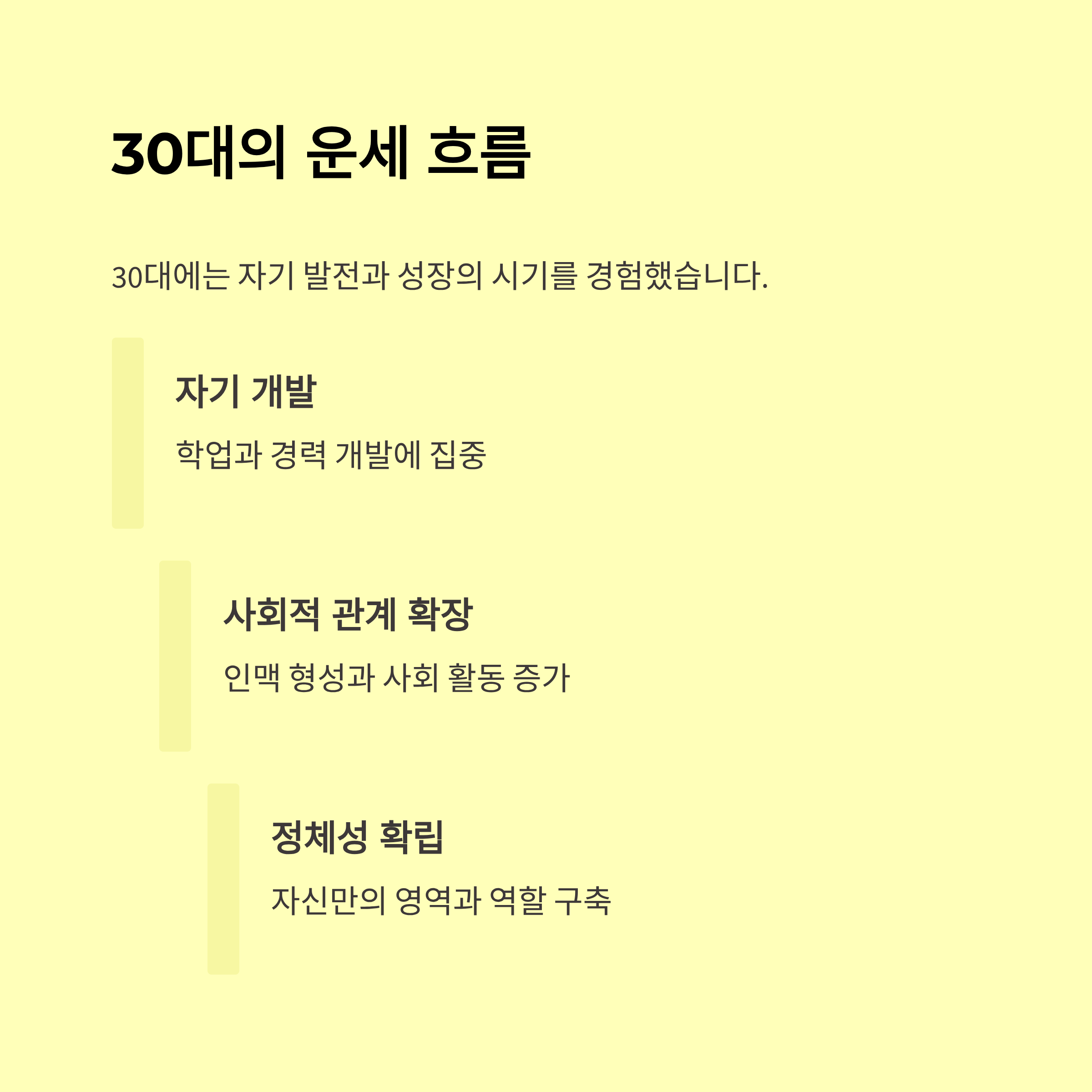 30대 후반까지는 자기 역량을 다지는 시기로, 다양한 경험을 통해 기반을 쌓았을 가능성이 커요. 이후에는 외부의 인정을 받으며 영향력을 확대하는 시기가 이어집니다.