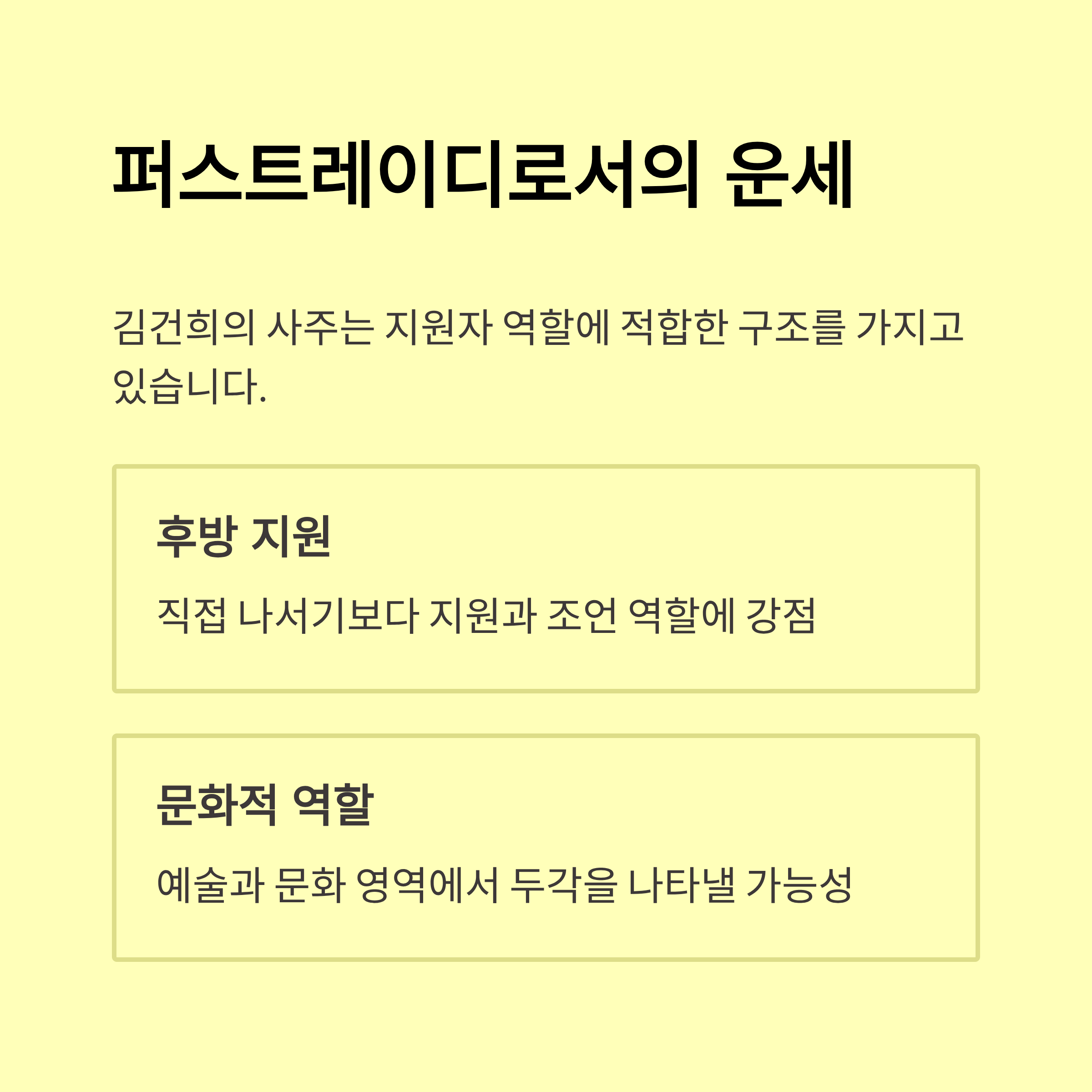 사주에서 ‘관성’과 ‘재성’이 균형 있게 나타나는 경우, 조직에서의 성공 가능성이 커요. 김건희 씨의 사주는 이러한 흐름을 보이며, 특히 기획, 경영, 문화 예술 분야에서의 활동이 잘 맞아요.