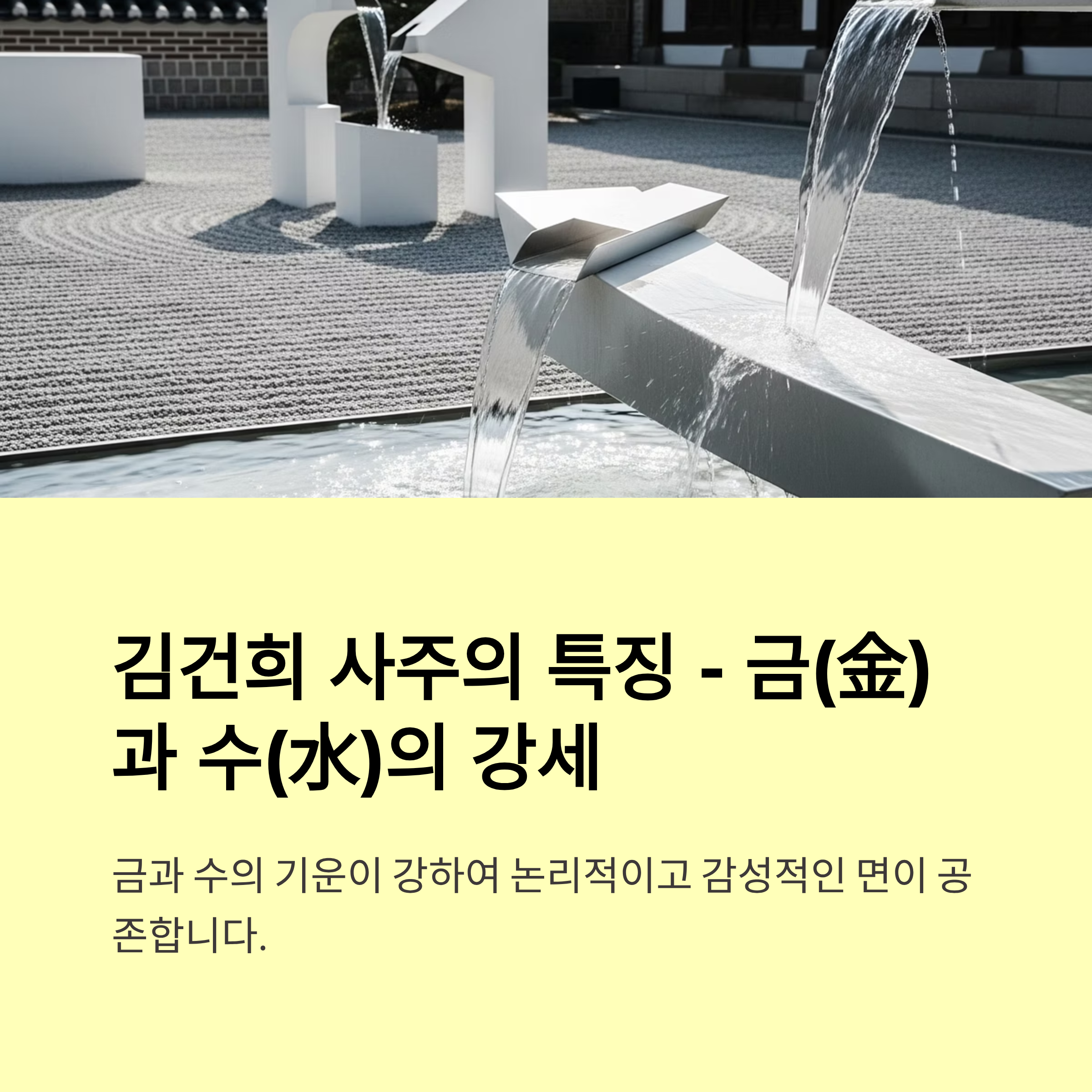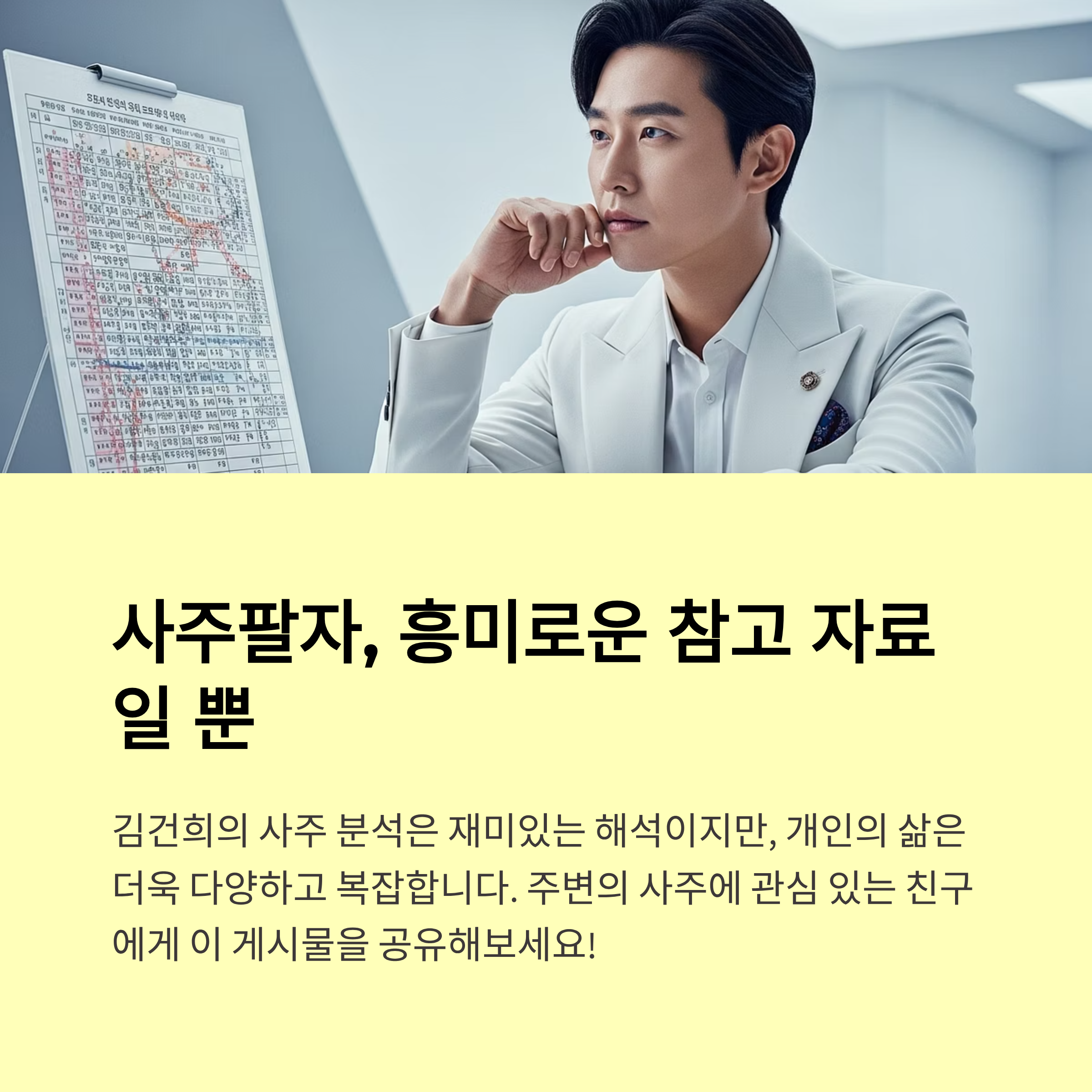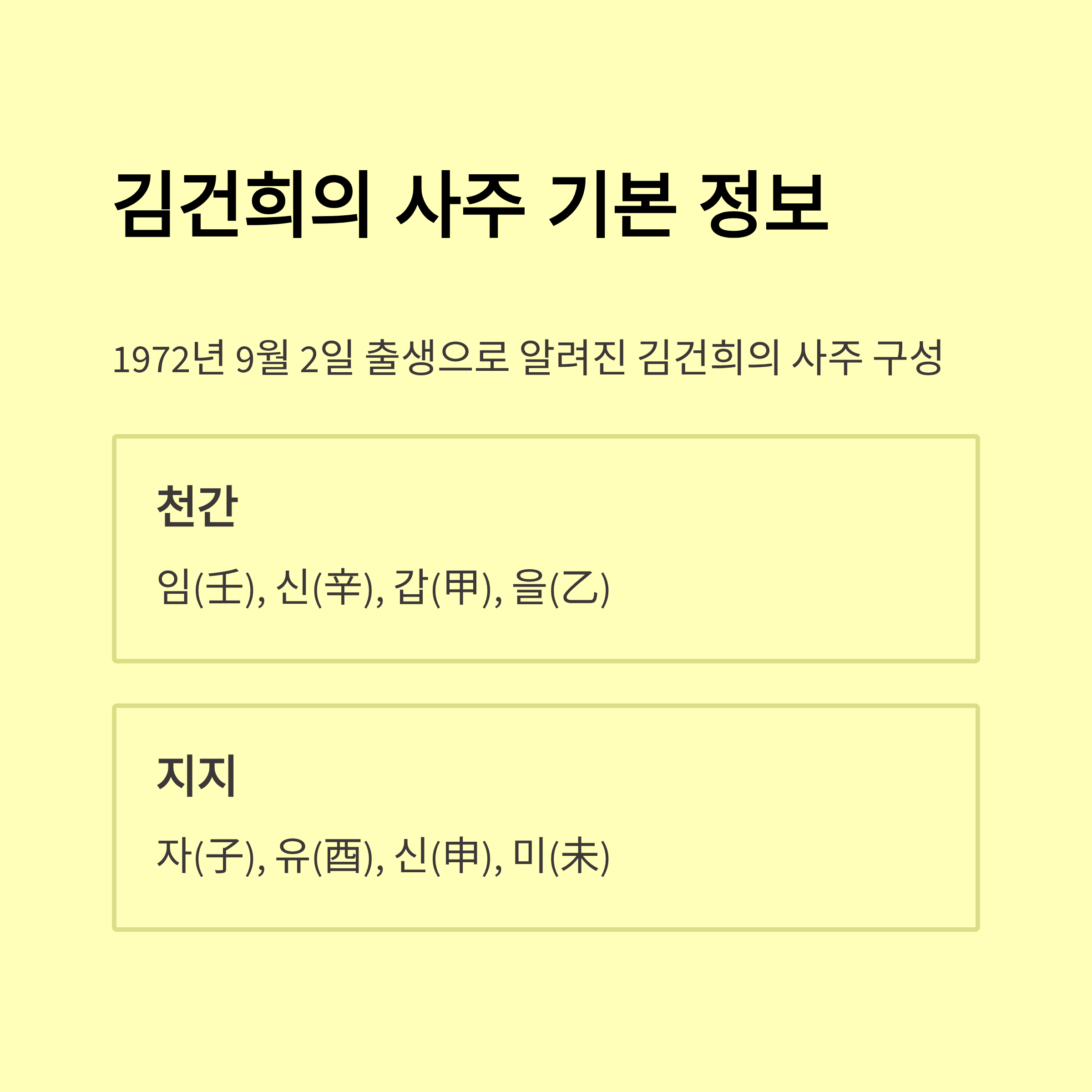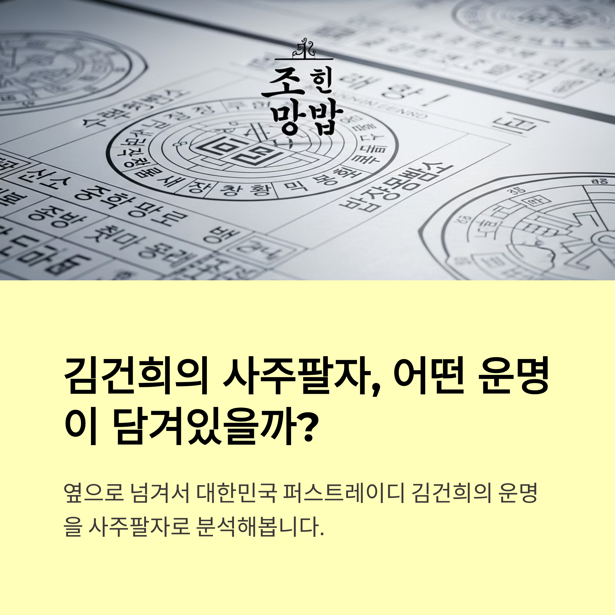이제 각 항목별로 구체적으로 살펴보면서, 김건희 씨의 사주가 가지는 특징을 하나씩 풀어볼게요. 제가 생각했을 때, 사주 분석은 단순히 운명을 맞히는 게 아니라 그 사람의 삶을 이해하는 하나의 관점이라고 봐요. 사주풀이 내용을 보면서 지금 김건희씨의 모습을 보면..사람의 사주는 그 사람이 어떤 생각과 어떤 행동을 했느냐에 따라 달라지는게 확실한거 같아요.