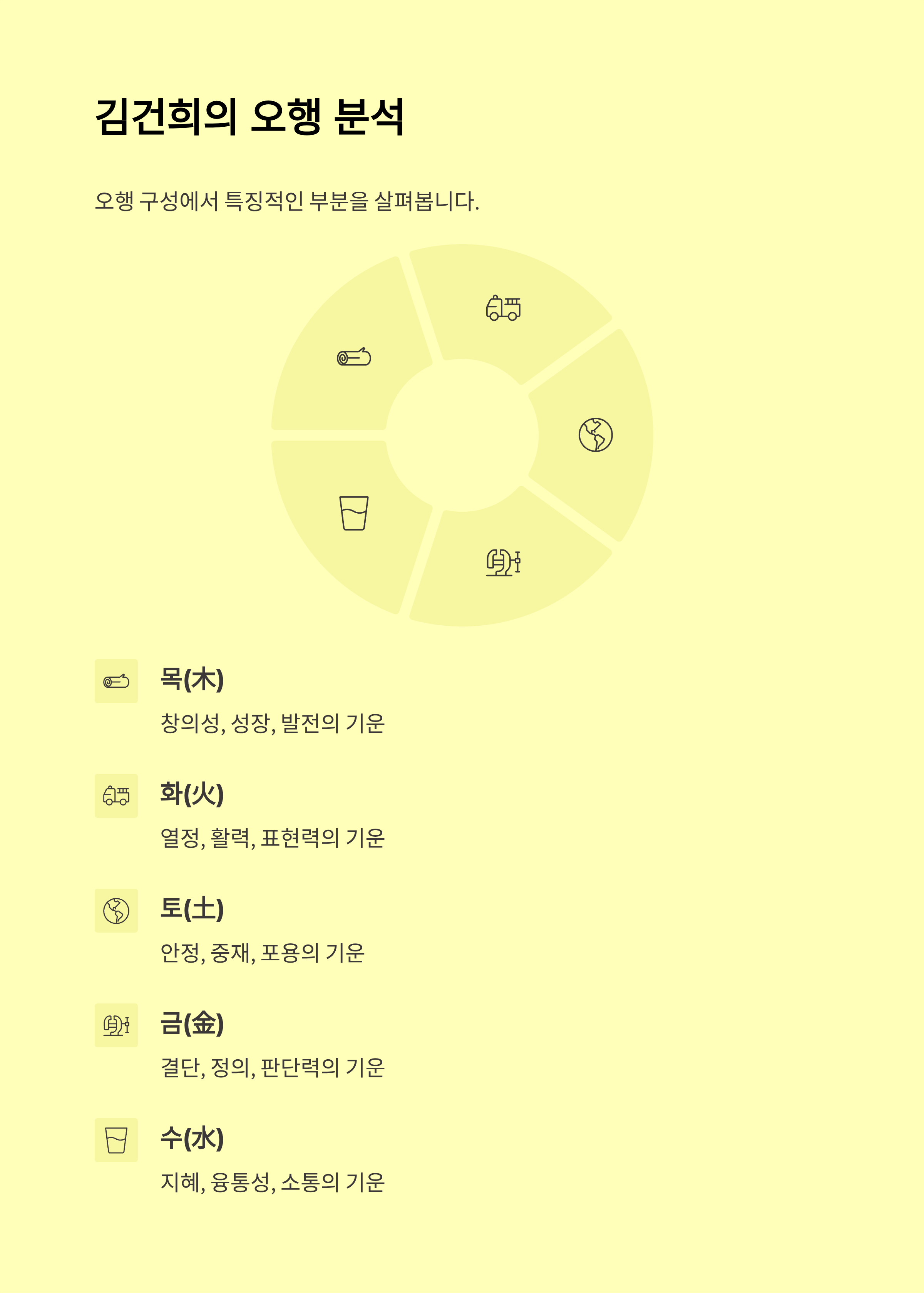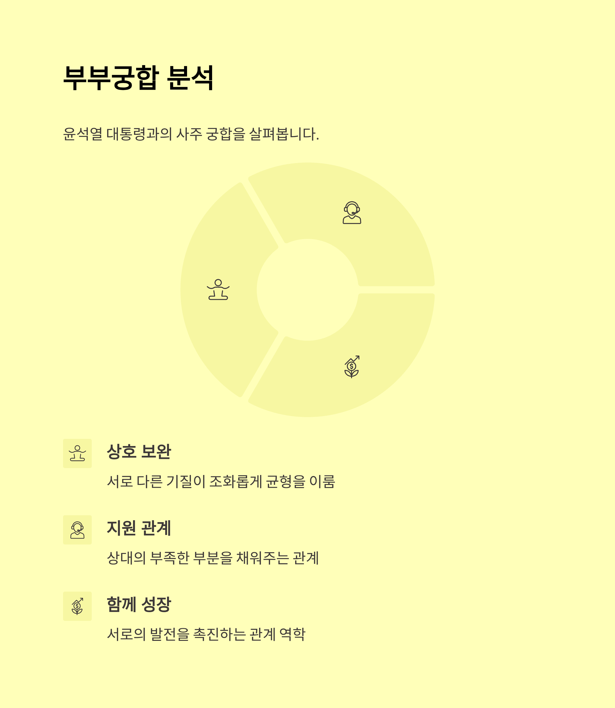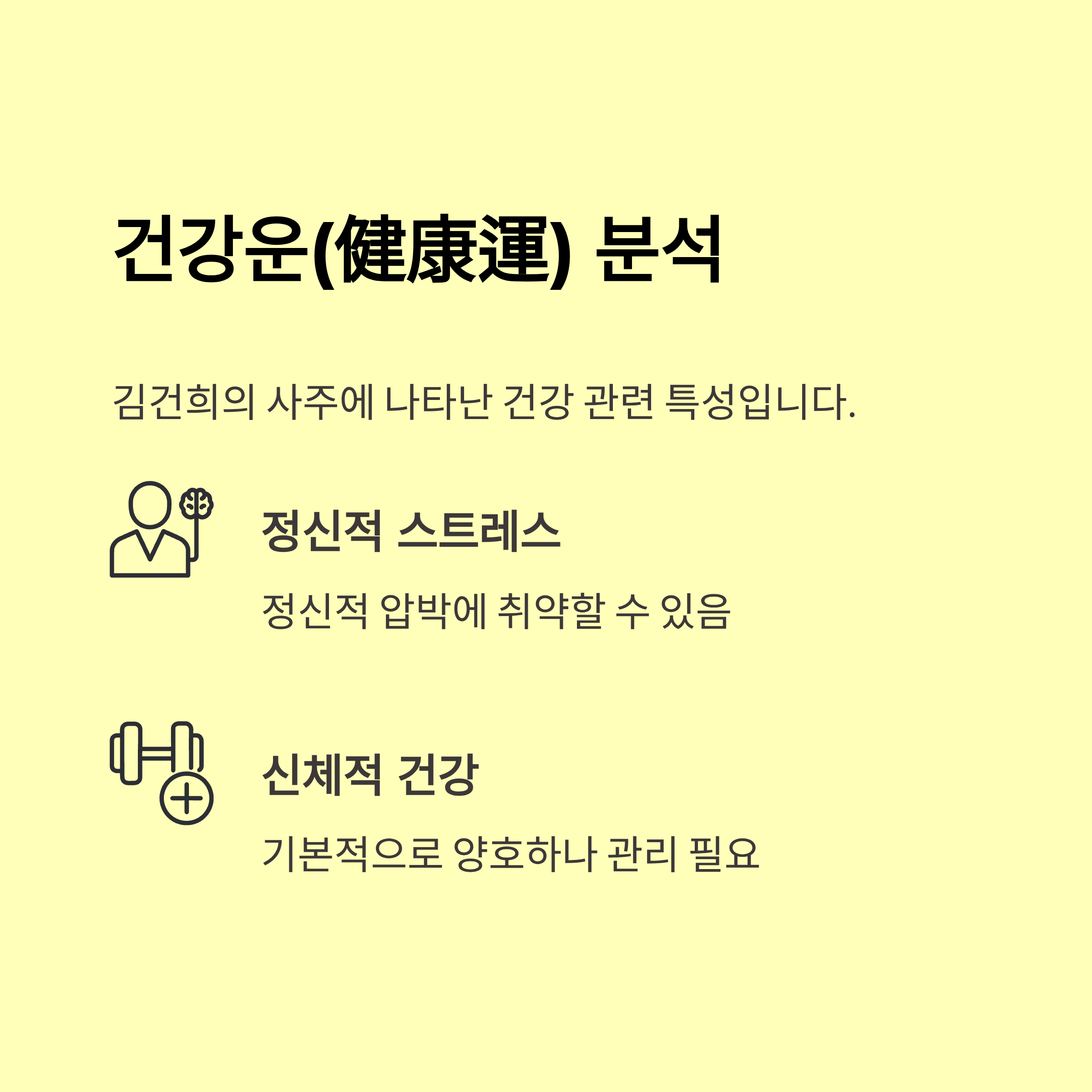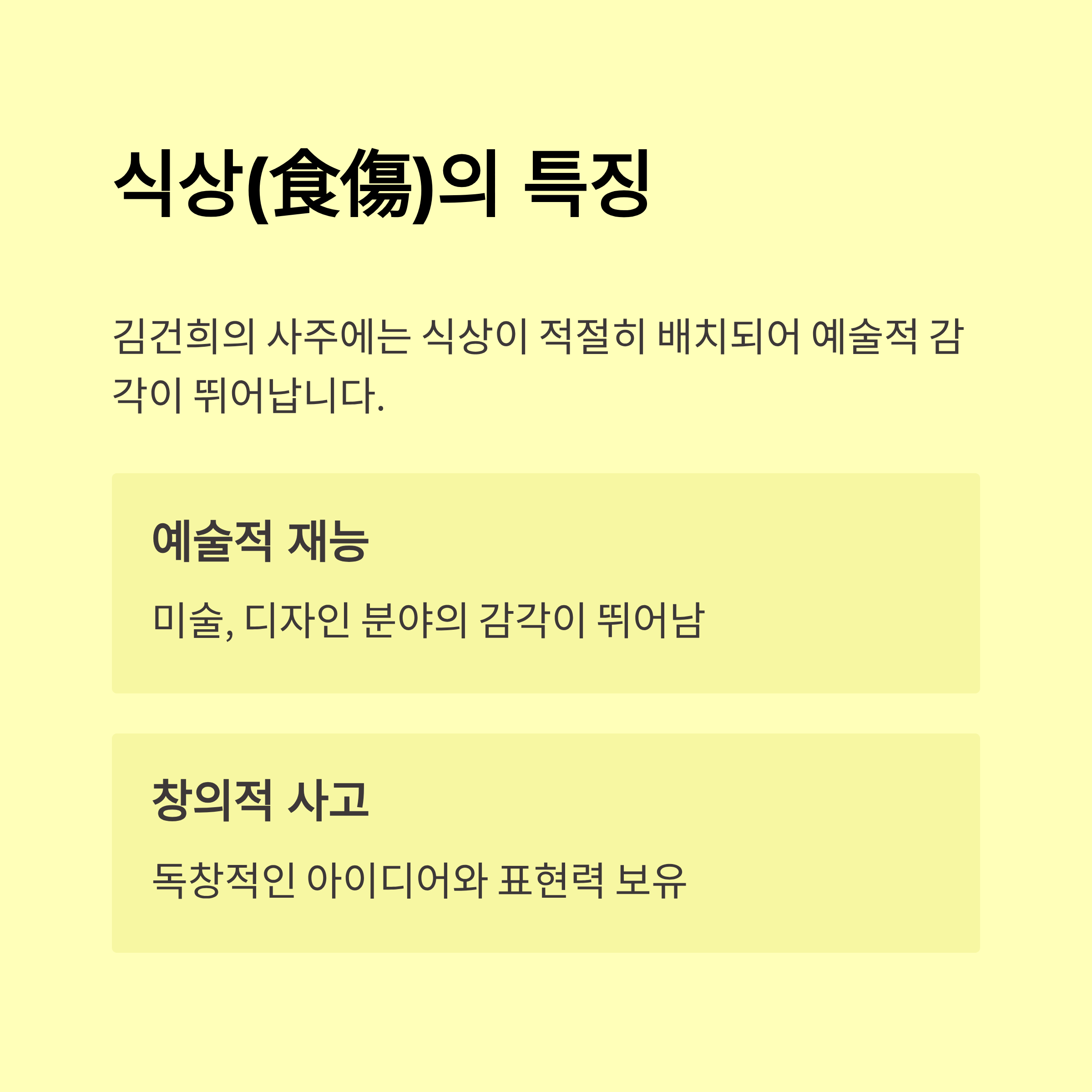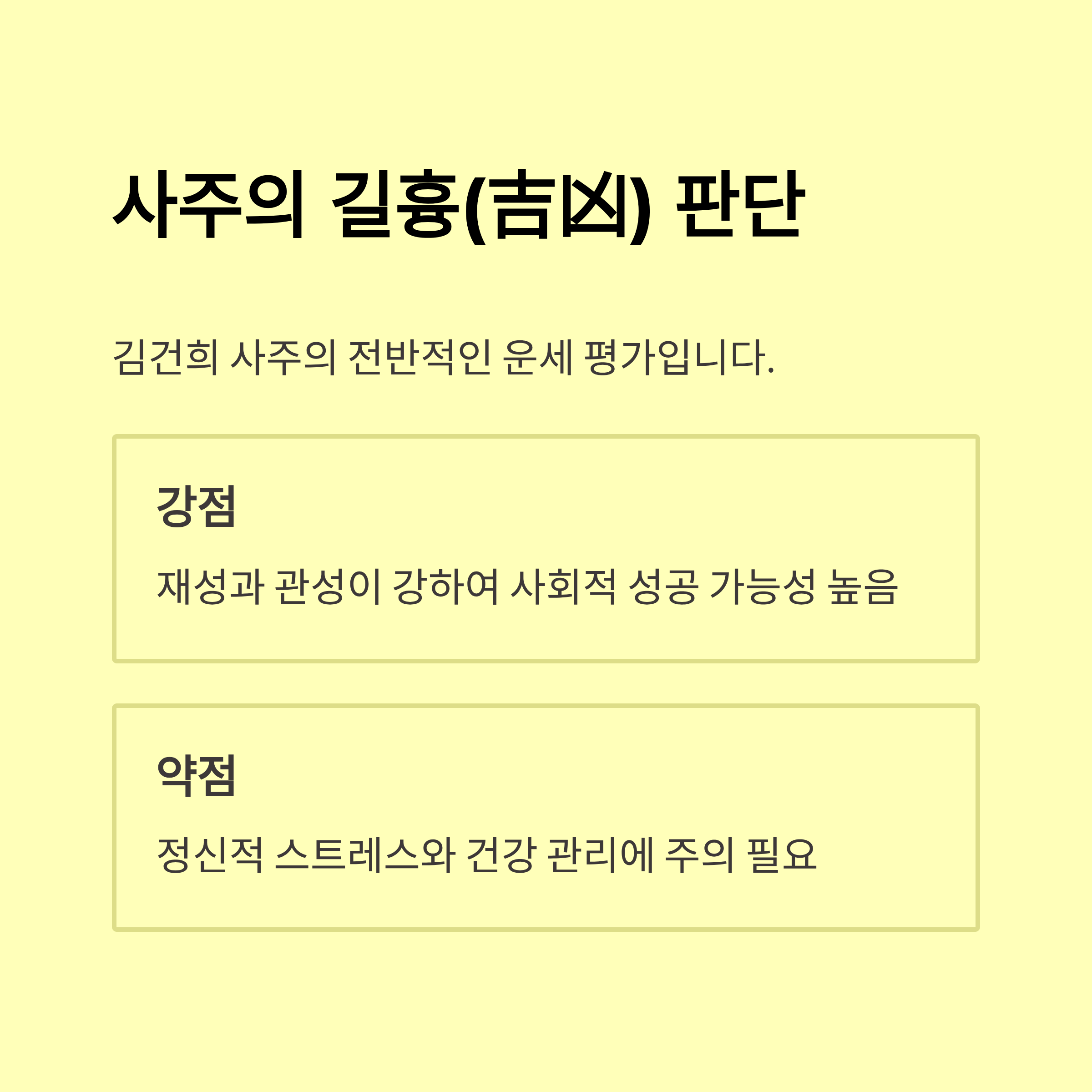 이제 각 항목별로 구체적으로 살펴보면서, 김건희 씨의 사주가 가지는 특징을 하나씩 풀어볼게요. 제가 생각했을 때, 사주 분석은 단순히 운명을 맞히는 게 아니라 그 사람의 삶을 이해하는 하나의 관점이라고 봐요. 사주풀이 내용을 보면서 지금 김건희씨의 모습을 보면..사람의 사주는 그 사람이 어떤 생각과 어떤 행동을 했느냐에 따라 달라지는게 확실한거 같아요.