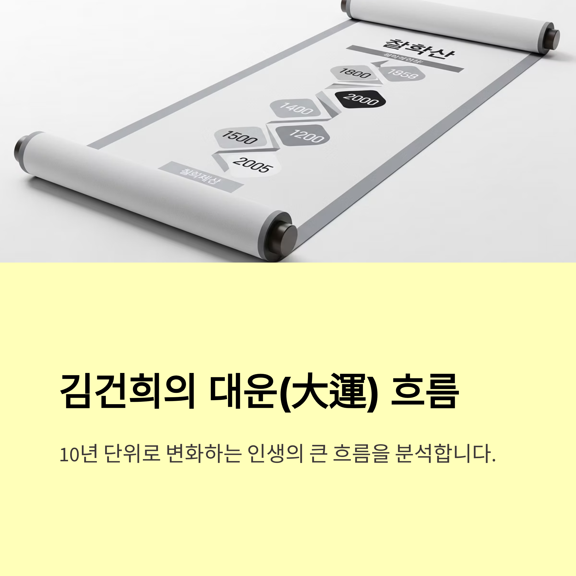 대운은 10년 단위로 흐르는 인생의 큰 운세 흐름이에요. 김건희 씨의 사주에서는 40대 이후 대운이 본격적으로 상승세에 접어드는 패턴이 보여요. 이는 사회적으로 주목받는 시기와 재물의 증가를 의미해요.