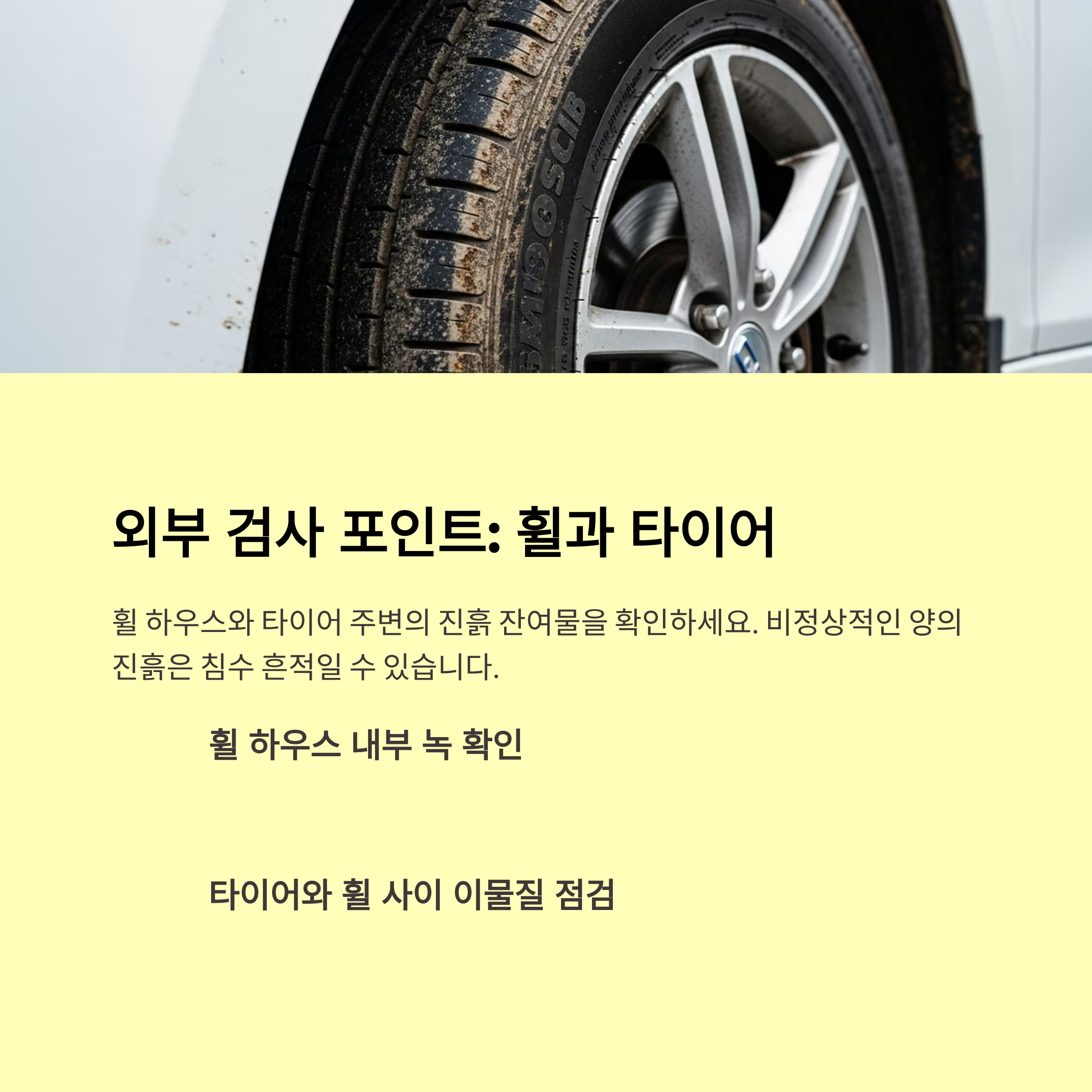 - 트렁크 밑, 타이어 교체부 확인: 진흙, 습기 흔적 유무 확인
