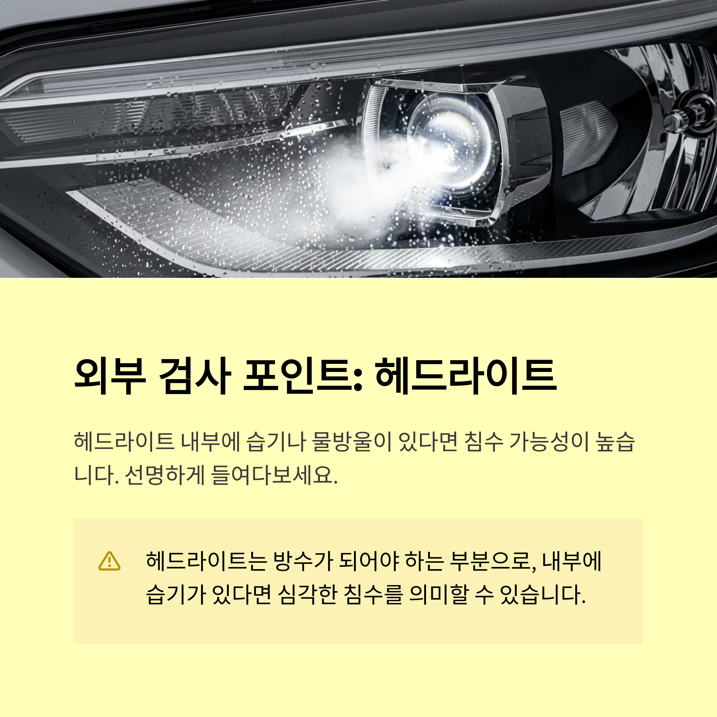 - 헤드라이트 및 후미등 내부 습기: 습기 찬 흔적은 침수 신호