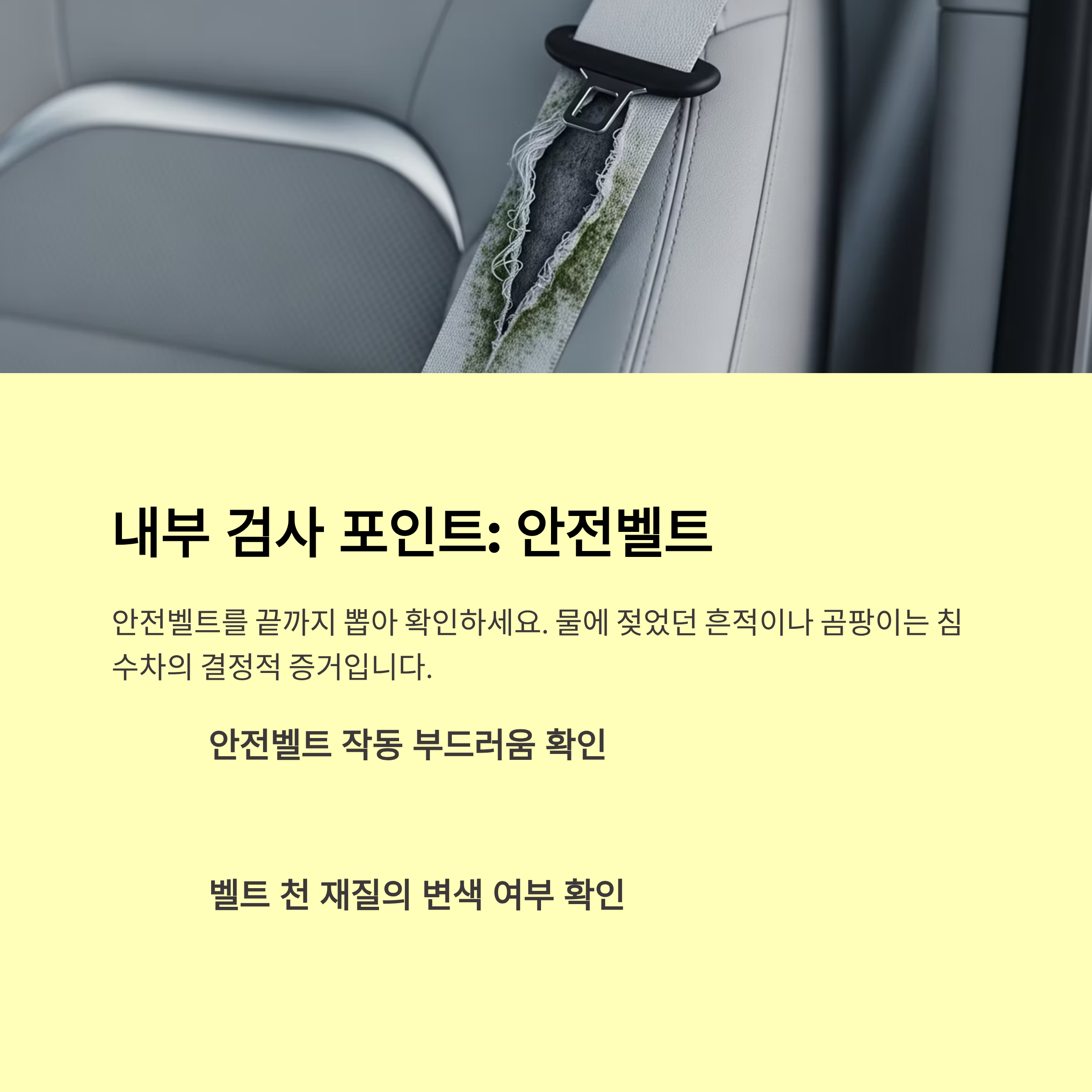 - 안전벨트 클립 및 끝단 확인: 흙먼지, 모래, 곰팡이 자국이 있으면 침수 가능성 큼