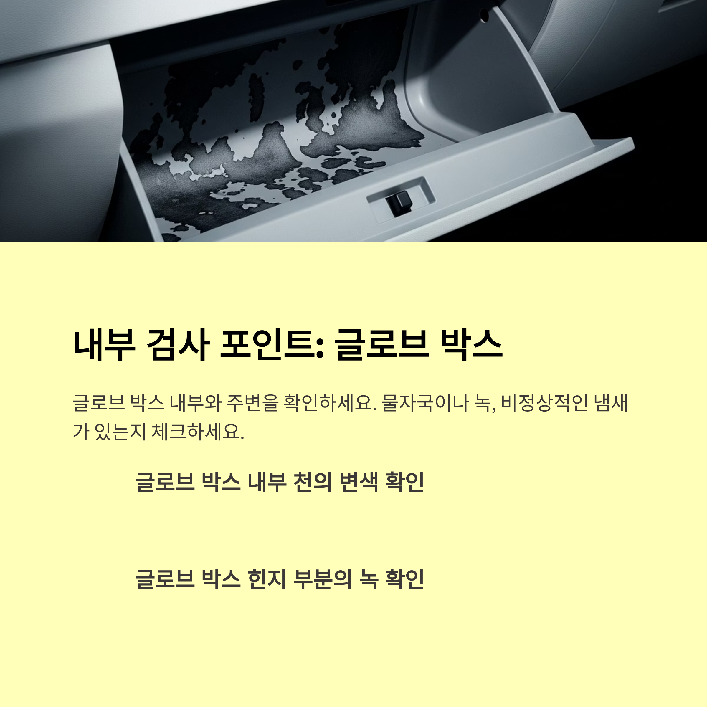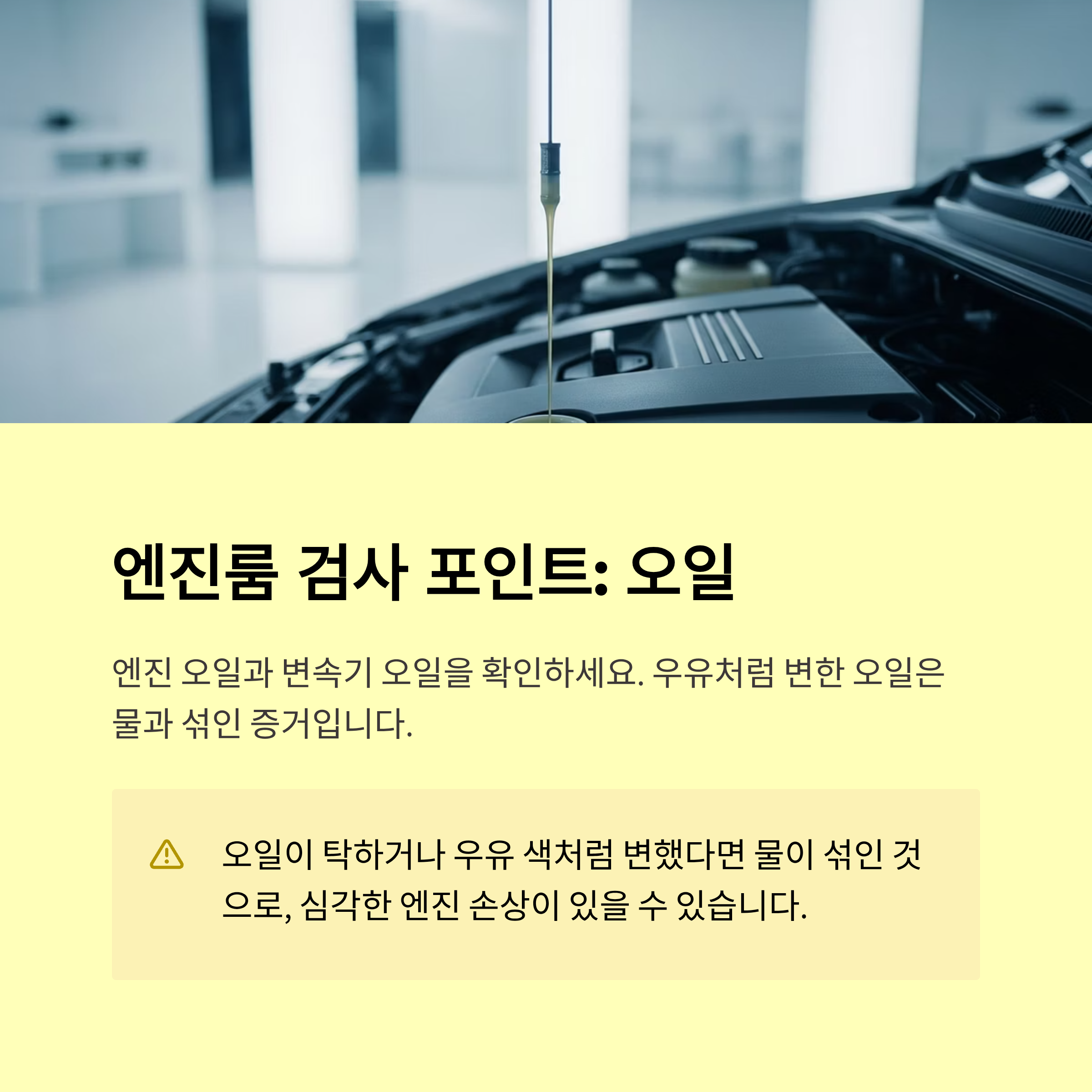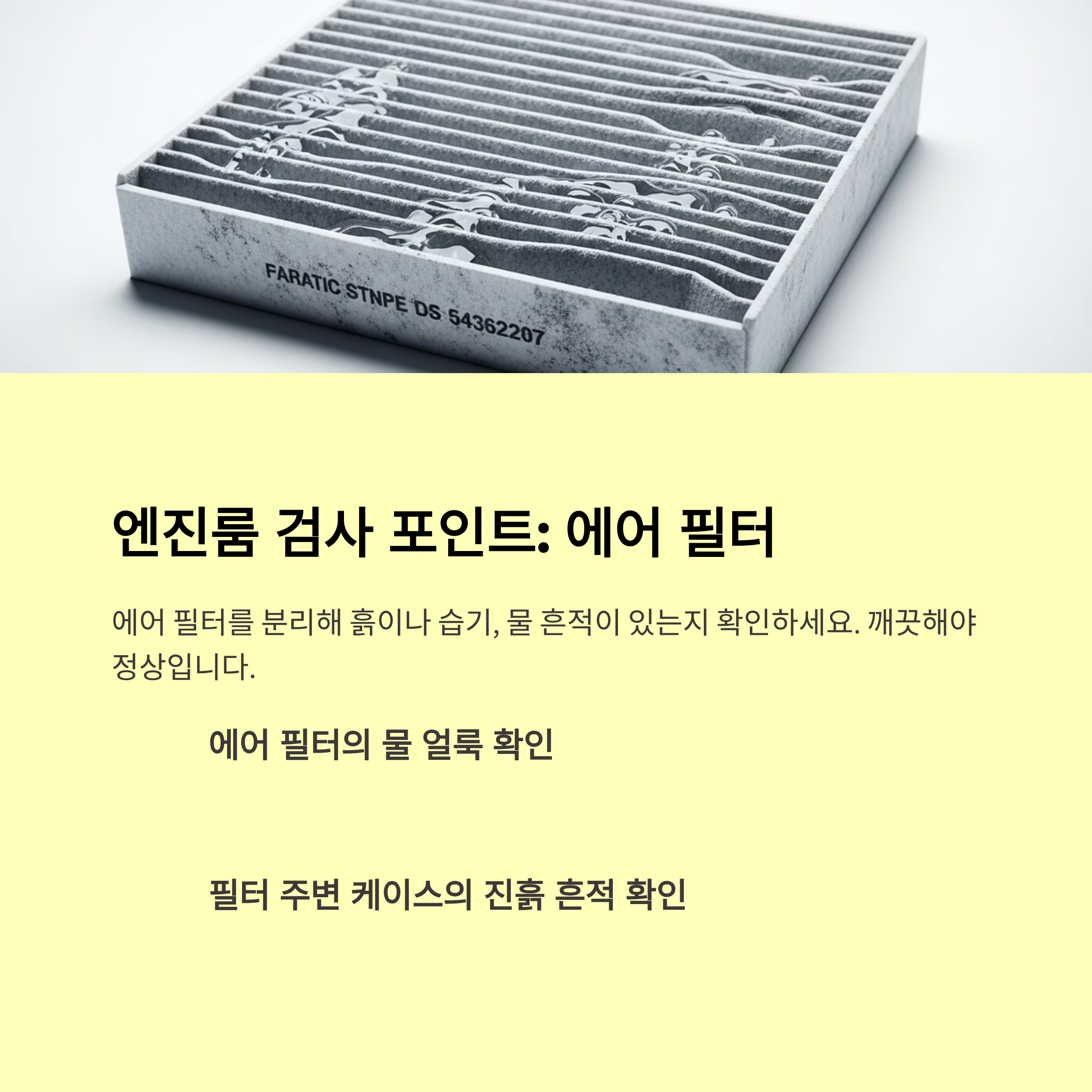 - 엔진룸 부식 및 오염 정도: 녹슬거나 침수 흔적 있으면 위험