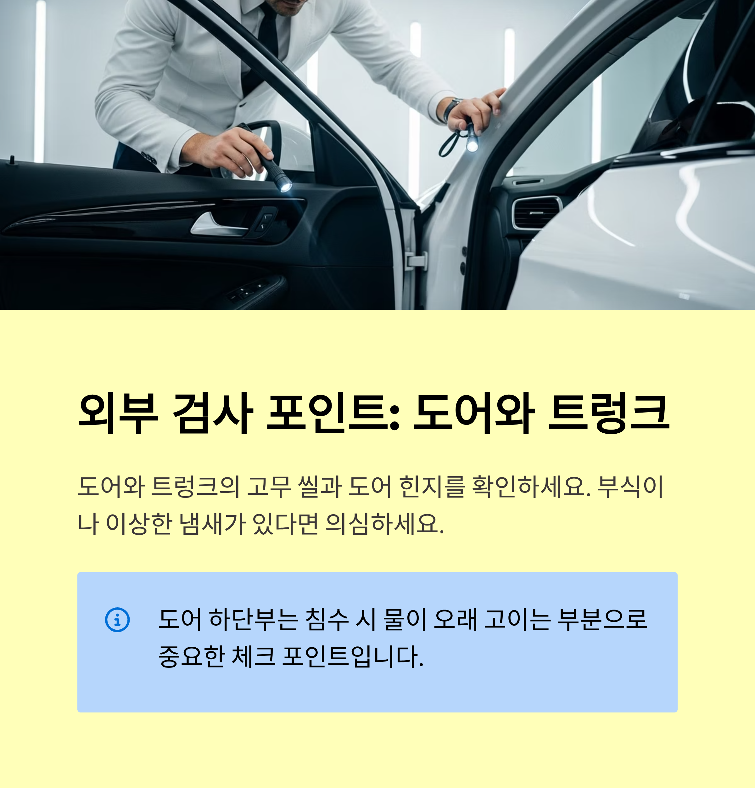 - 직접 점검 강화: 알려진 침수차 징후를 꼼꼼히 확인하고, 가능하면 자동차 전문가를 동반해 상태를 점검받으세요.
