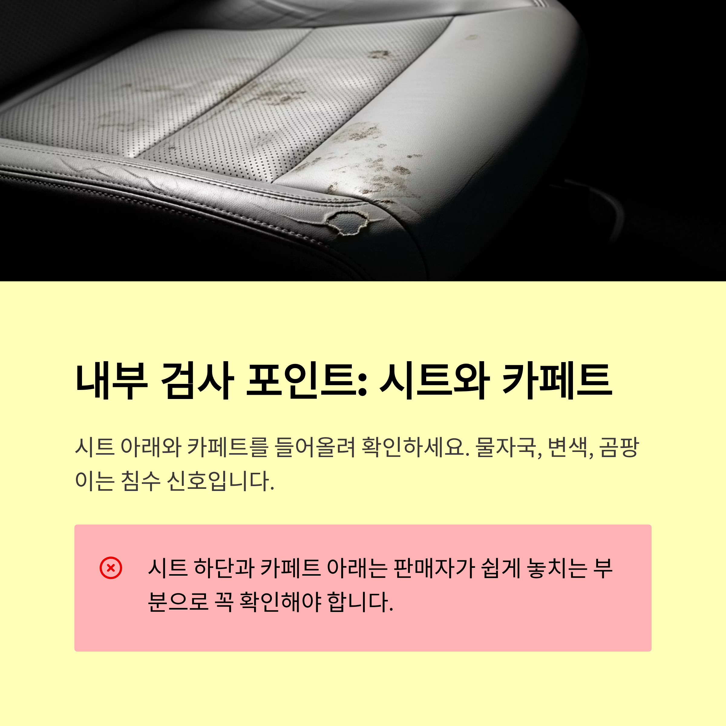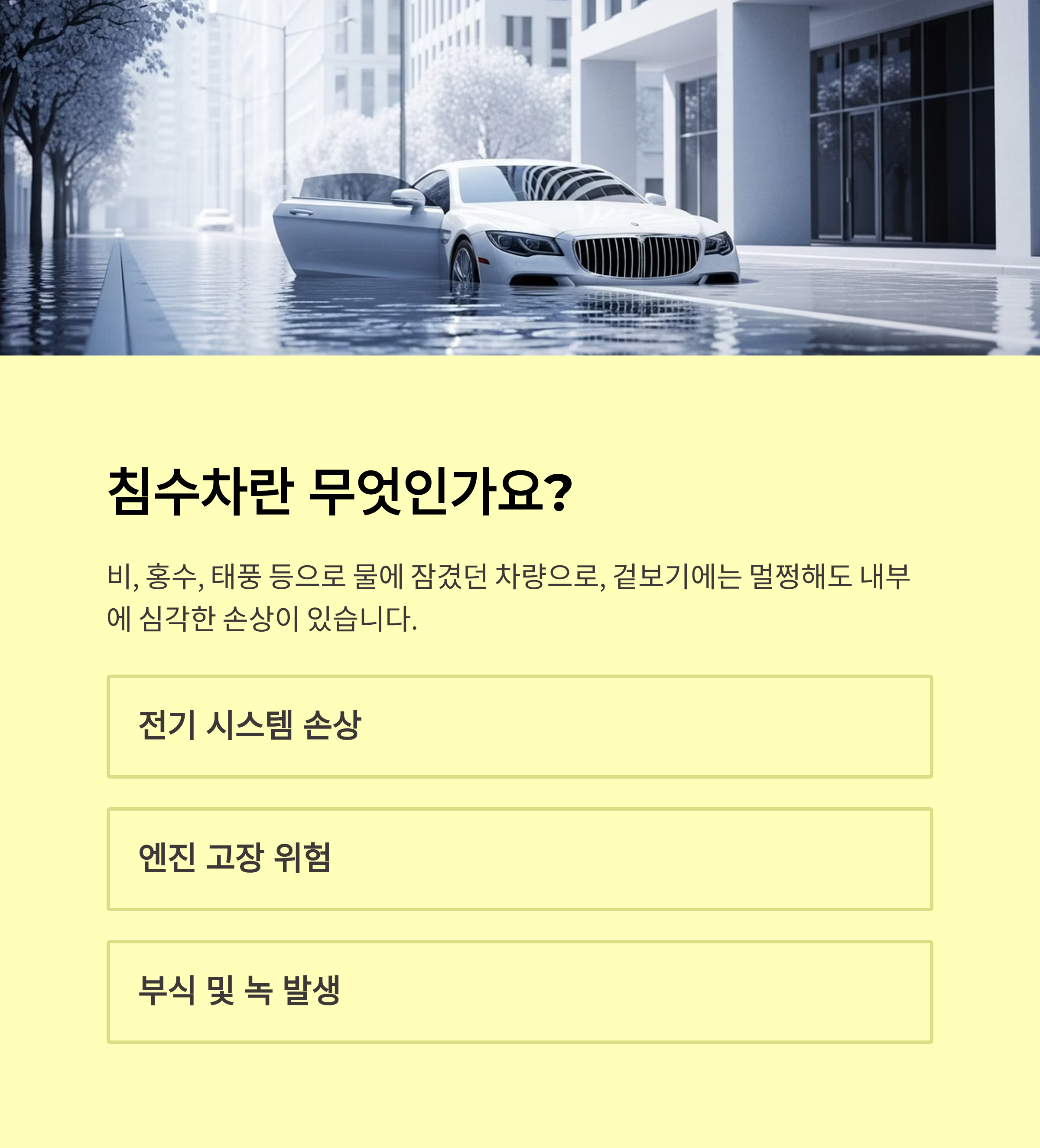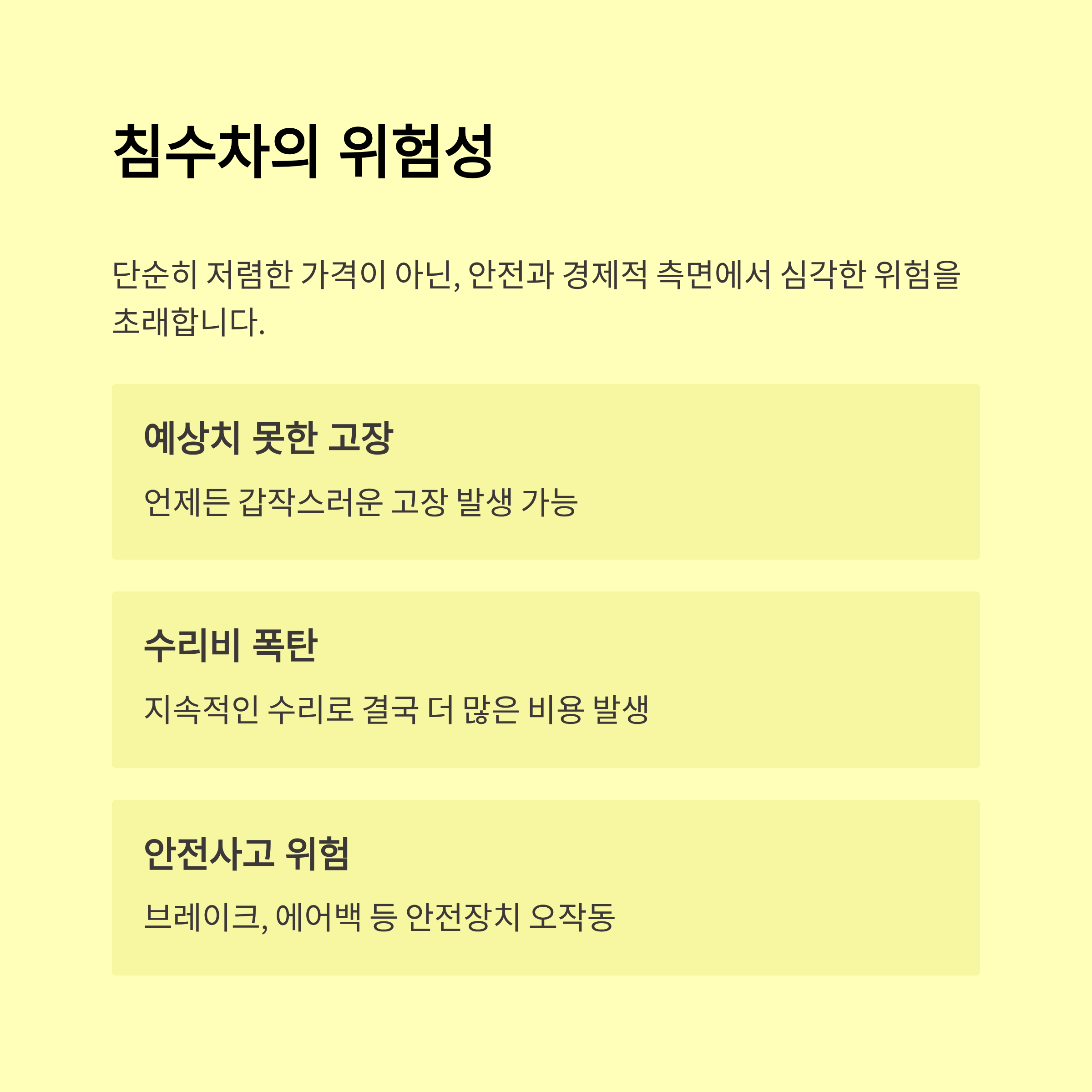 - 비정상적 저가 차량 경계: 주변 시세보다 지나치게 싼 중고차는 침수 가능성이 높으므로 주의가 필요합니다.