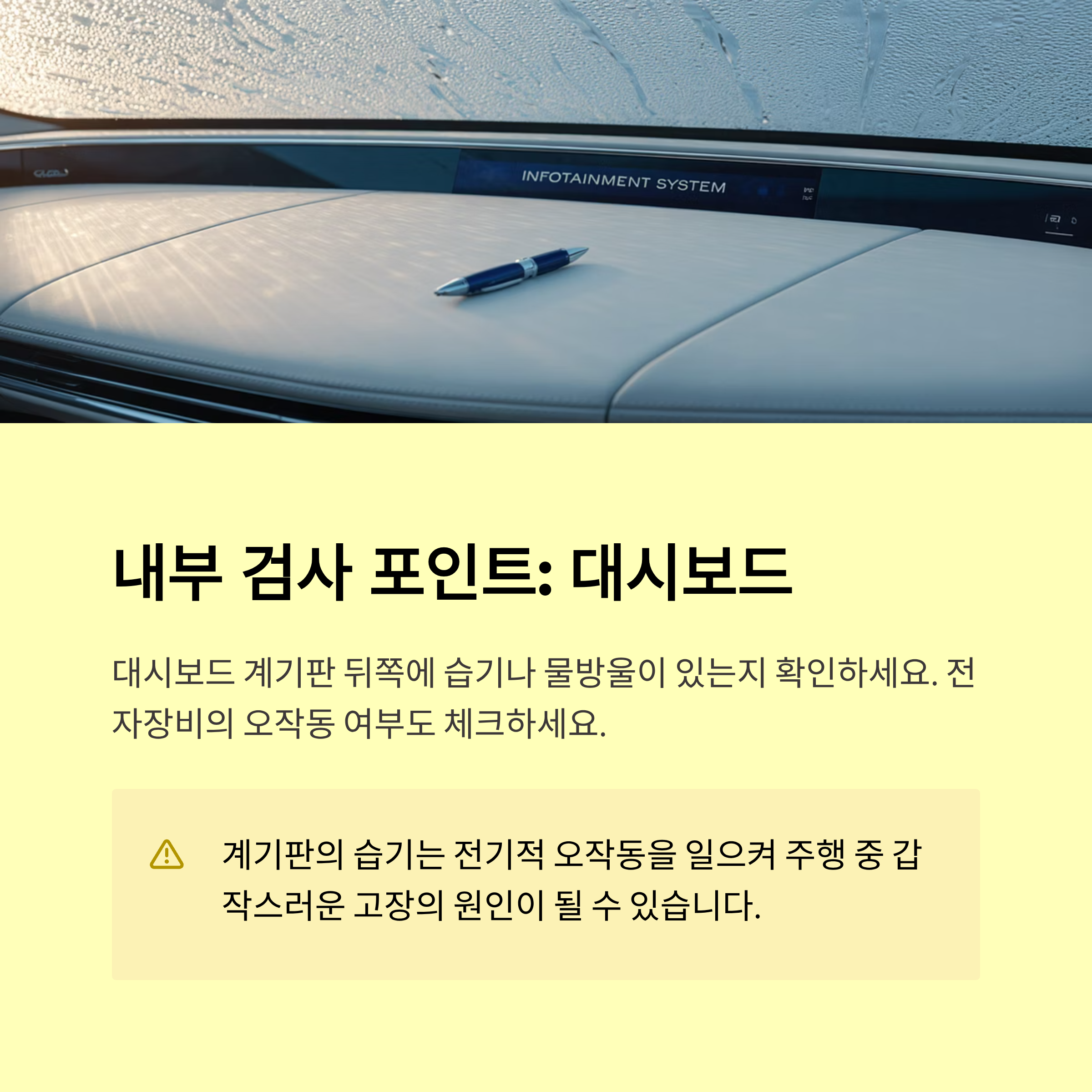 - 과거 수리/교체 내역 확인: 교환 부품이 침수 피해를 말해줄 수 있음