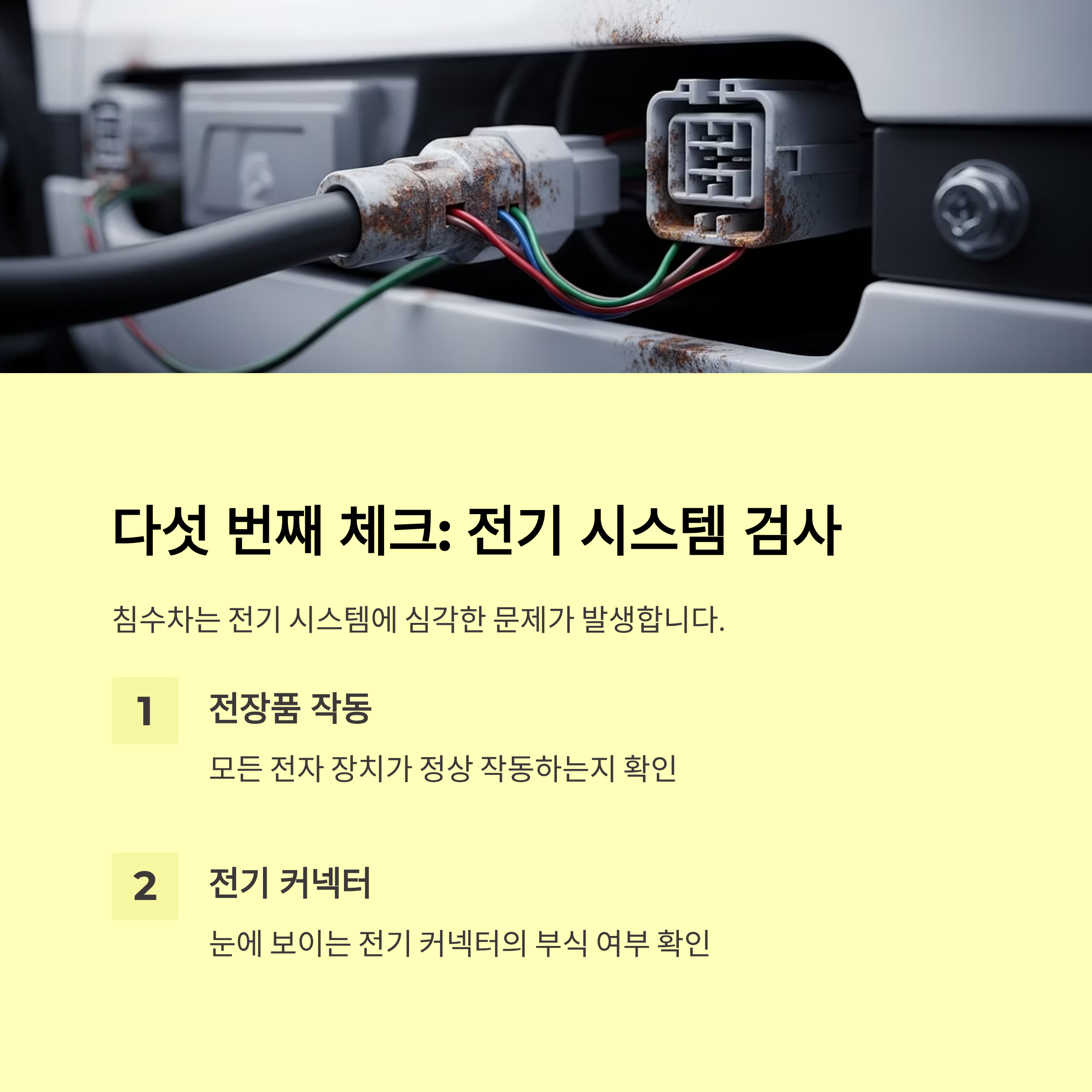- 주행 계기판 및 전기 부품 작동 상태: 오류 발생, 감전 등 침수 영향